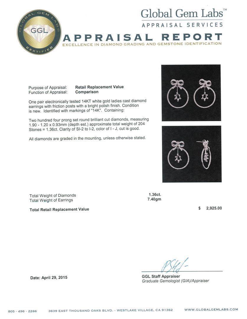 One pair electronically tested 14KT white gold ladies cast diamond earrings with friction posts with a bright polish finish. Identified with markings of "14K". Condition is new. Containing: Two Hundred Four prong set round brilliant cut diamonds, measuring 1.90 - 1.20 x 0.93mm (depth est.) approximate total weight of 204 Stones = 1.36ct. Clarity: SI-2 to I-2. Color: I - J, Cut is Good. All diamonds are graded in the mounting, unless otherwise stated. Total Weight of Diamonds 1.36ct. Total Weight of Earrings 7.40 grams. GGL Appraised at $2,925.00.
