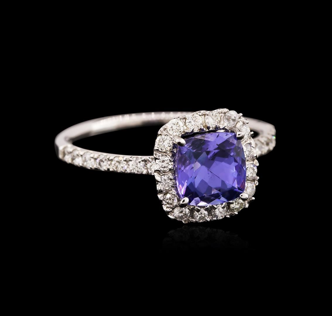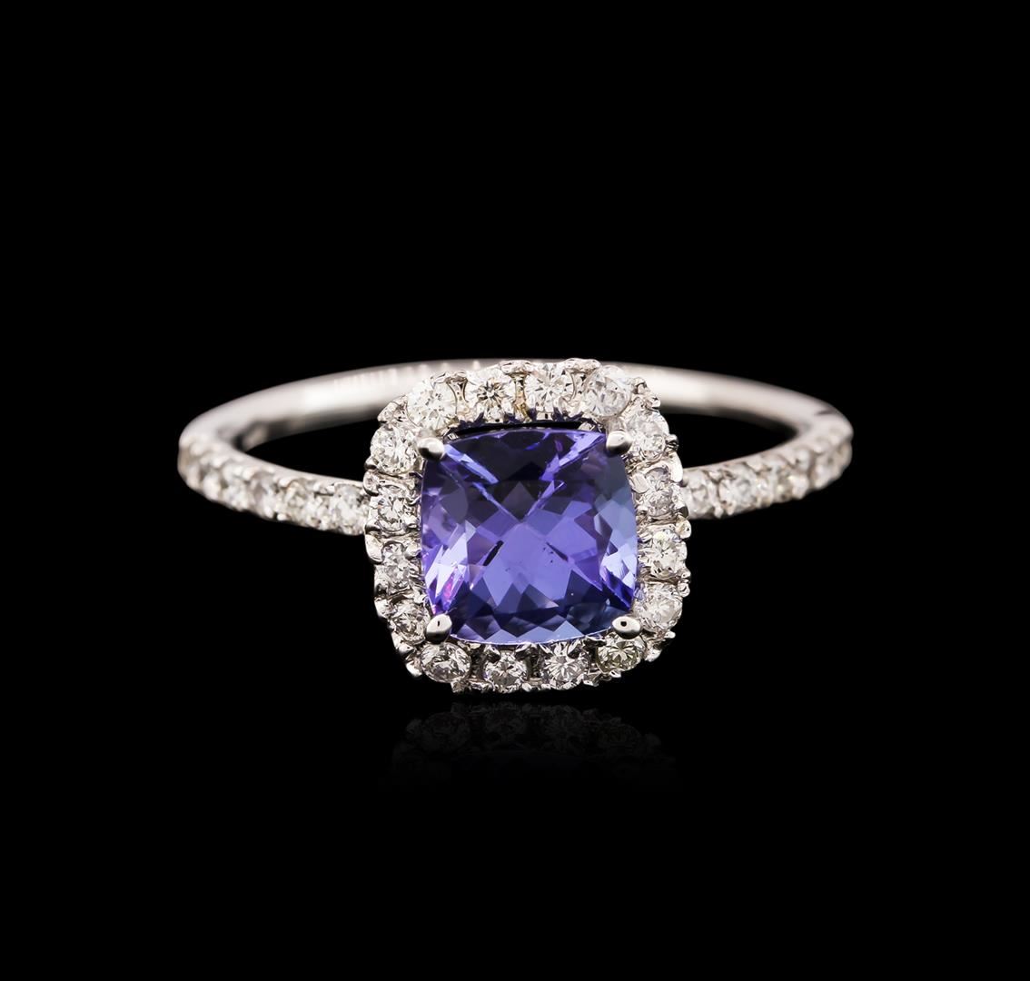 One electronically tested 14KT white gold ladies cast tanzanite and diamond ring with a bright polish finish. Identified with markings of "14K". Condition is new. Containing: One prong set square cushion modified brilliant cut natural tanzanite, measuring 6.47 x 6.39 x 4.18mm, approximate weight of 1.36ct., clarity is eye clean, type I, medium light, very slightly grayish, violet color, (GIA V 4/3), cut is good. Thirty prong set round brilliant cut diamonds, measuring 1.10 - 1.10 x 0.66mm (depth est.) approximate total weight of 30 Stones = 0.14ct. Clarity: I-1 to I-2. Color: I - J. Colored gemstones are presumed to have been subjected to commonly used enhancement processes. All diamonds and colored gemstones are graded in the mounting, unless otherwise stated. Total Weight of Colored Stones 1.36ct. Total Weight of Diamonds 0.14ct. Total Weight of Ring 2.20 grams. GGL Appraised at $2,010.00.