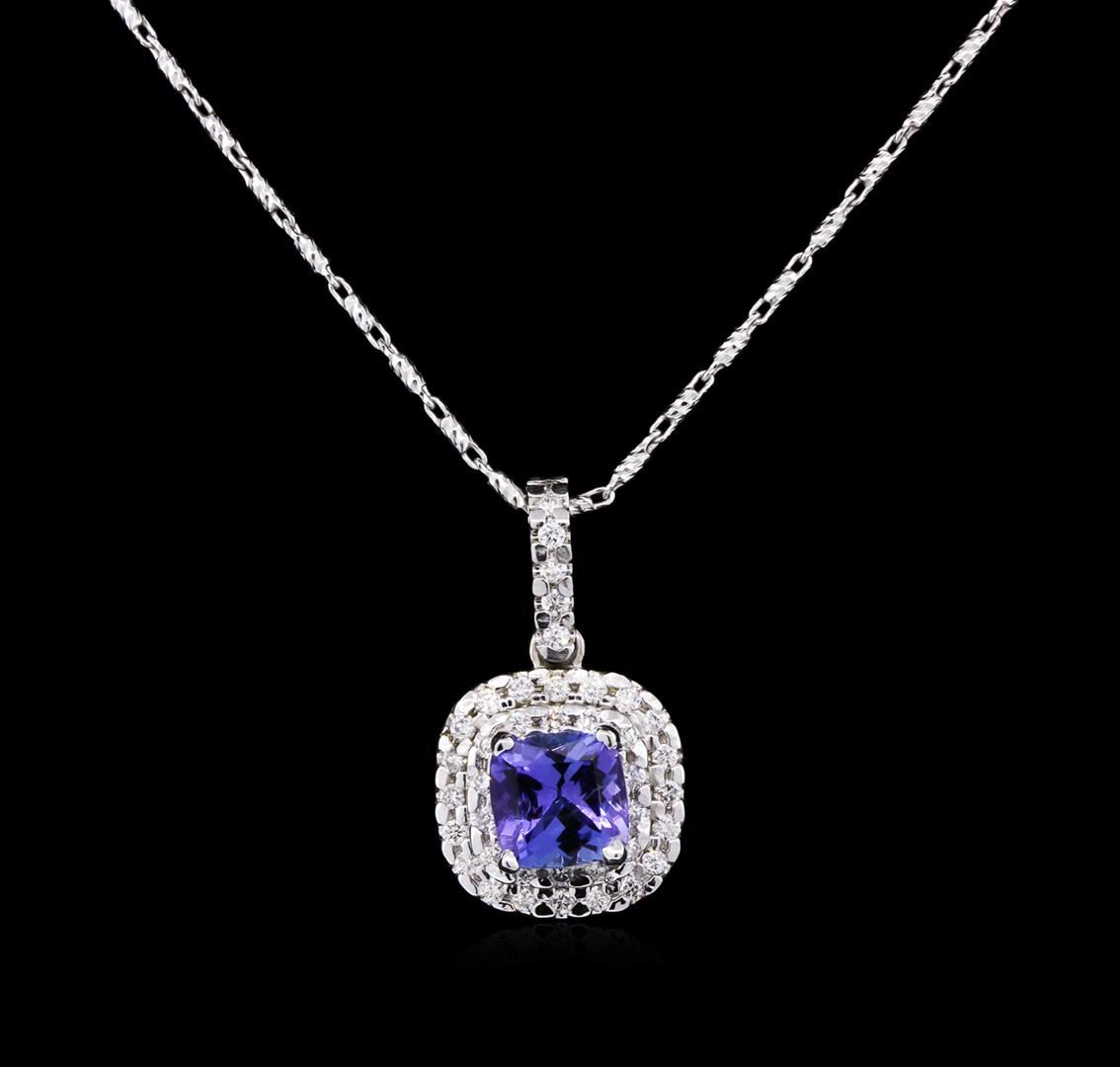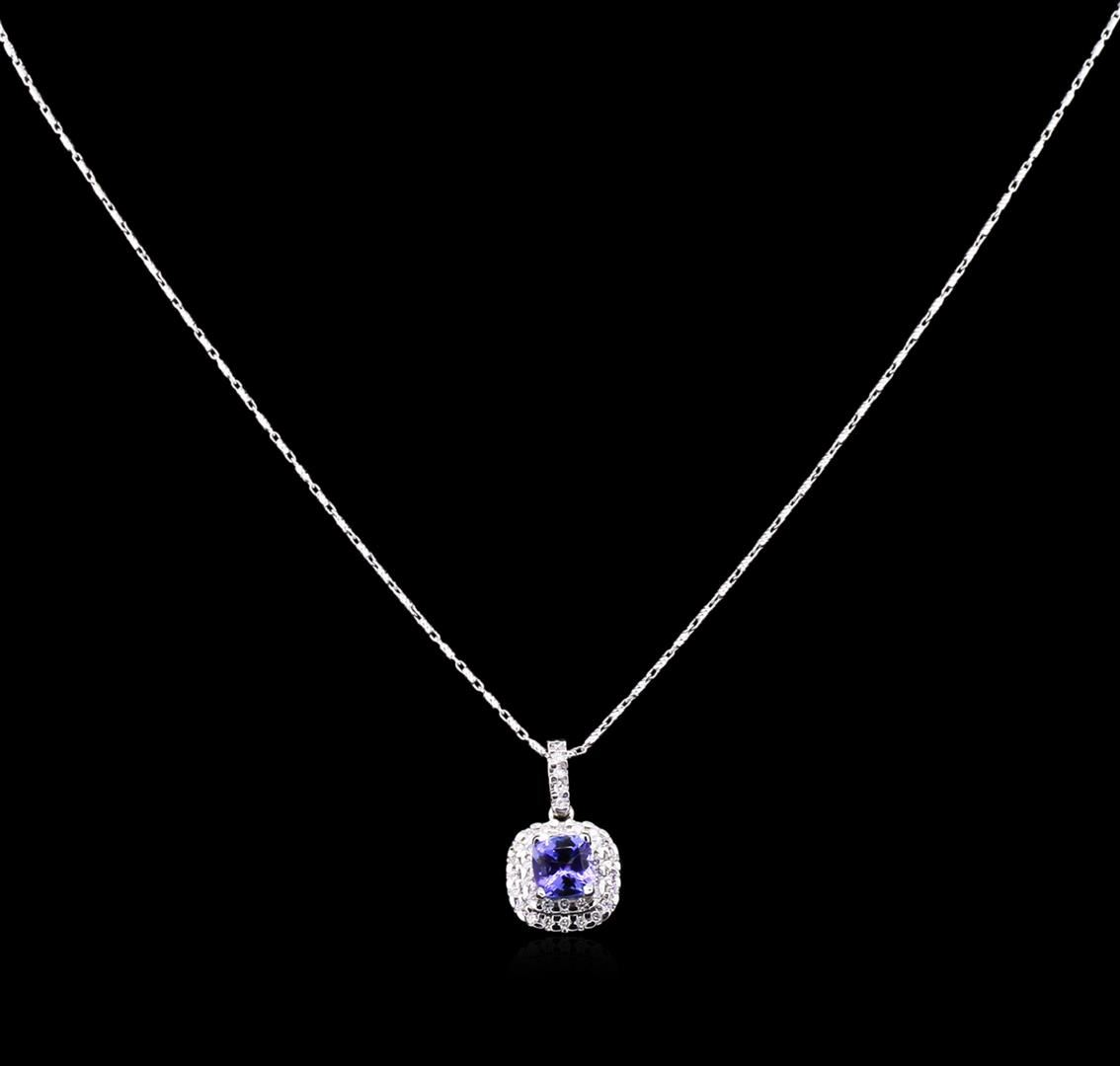 One electronically tested 14KT white gold ladies combination cast & assembled tanzanite and diamond pendant & chain 18.3" long, fancy link with a lobster claw clasp with a bright polish finish. Condition is new. Containing: One prong set square cushion modified brilliant cut natural tanzanite, measuring 6.48 x 6.47 x 4.13mm, approximate weight of 1.36ct., clarity is eye clean, type I, medium light, moderately strong, violet color, (GIA V 4/4), cut is good. Forty prong set round brilliant cut diamonds, measuring 1.20 - 1.20 x 0.72mm (depth est.) approximate total weight of 40 Stones = 0.25ct. Clarity: SI-1 to I-1. Color: H - I, Cut is Good. All diamonds and colored gemstones are graded in the mounting, unless otherwise stated. Colored gemstones are presumed to have been subjected to commonly used enhancement processes. Total Weight of Colored Stones 1.36ct. Total Weight of Diamonds 0.25ct. Total Weight of Pendant & Chain 6.40 grams. GGL Appraised at $3,395.00.