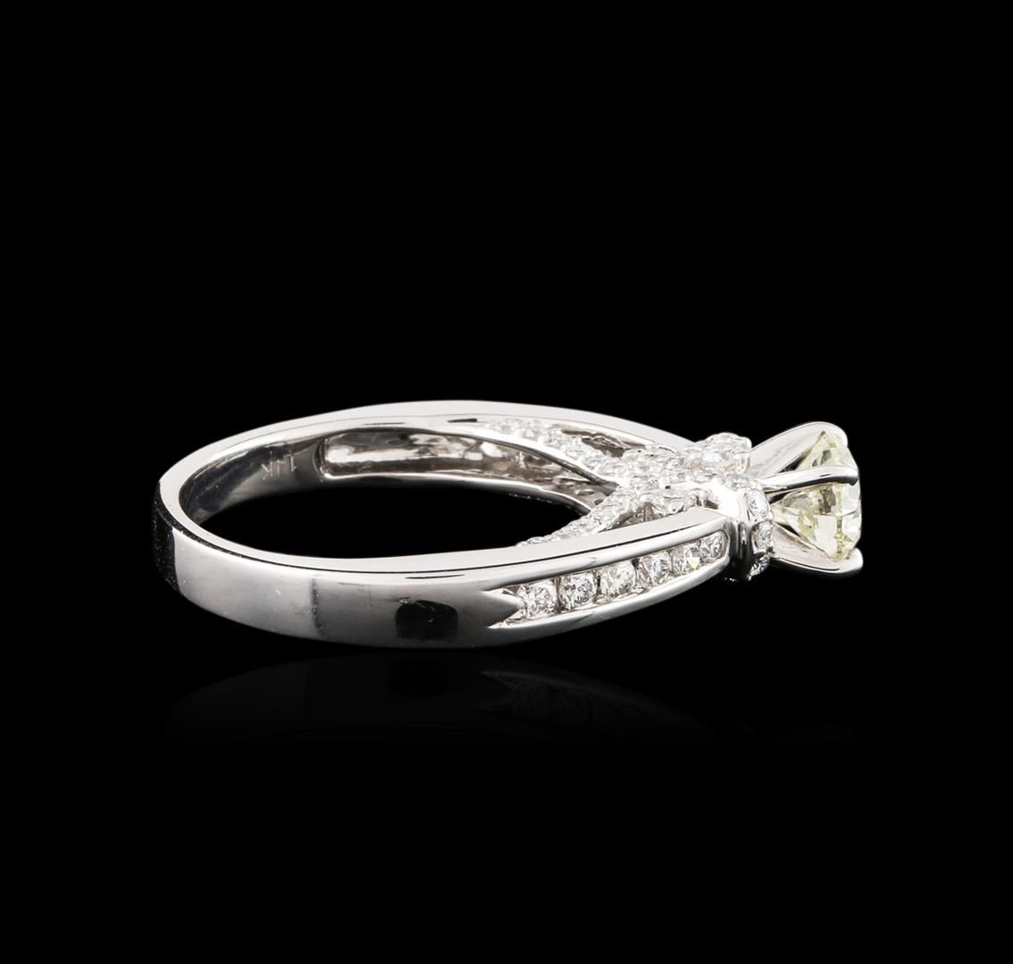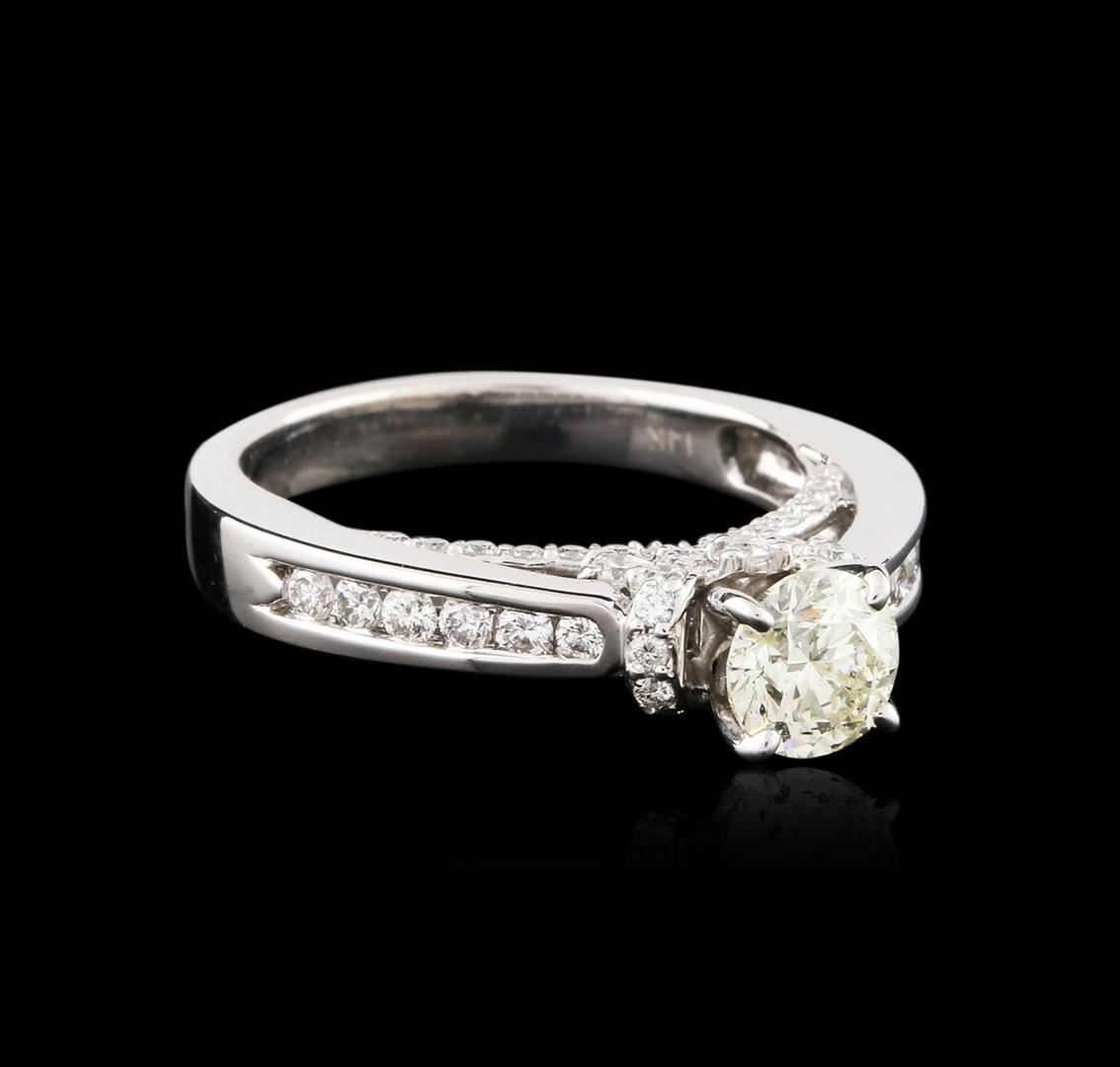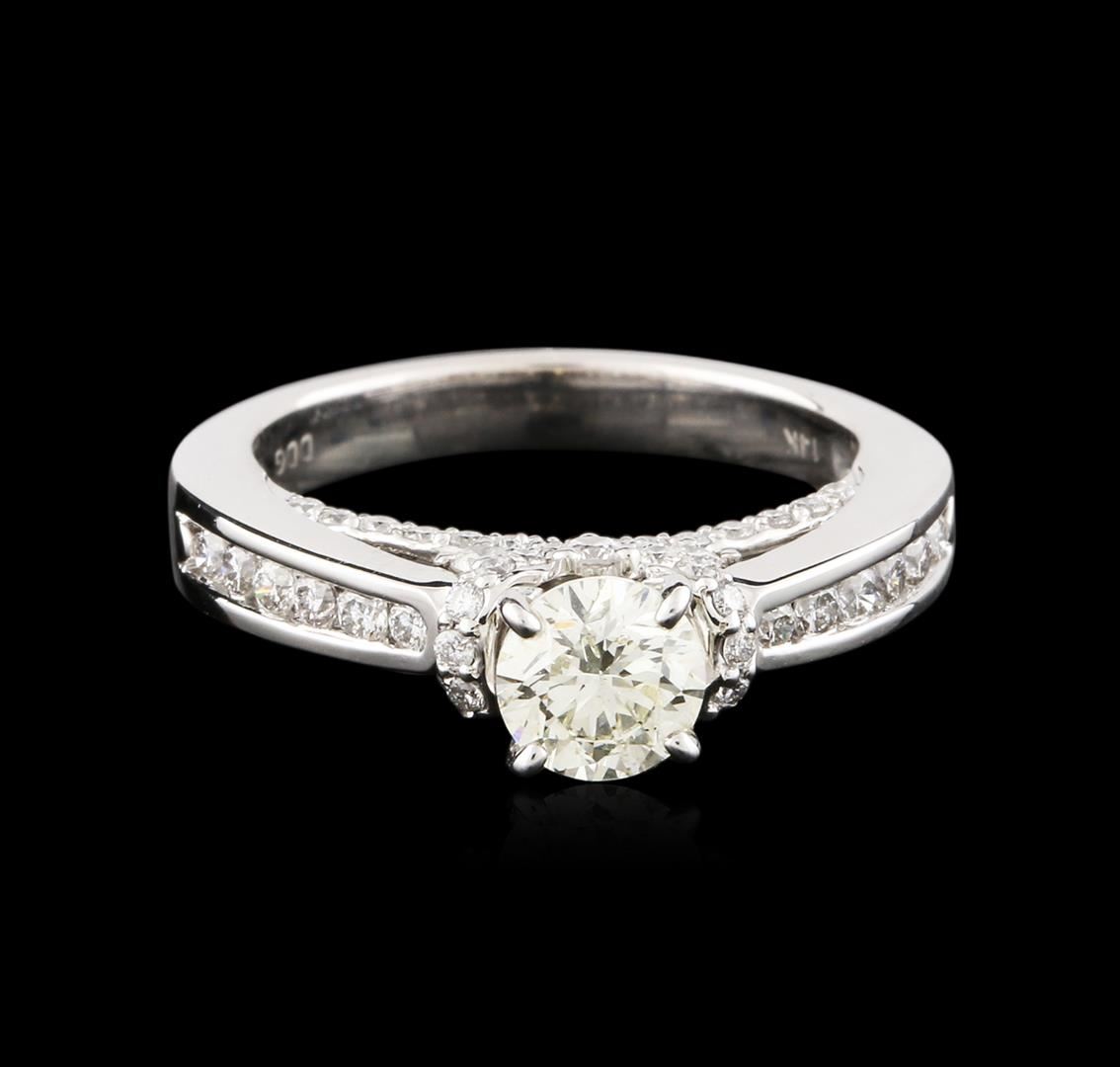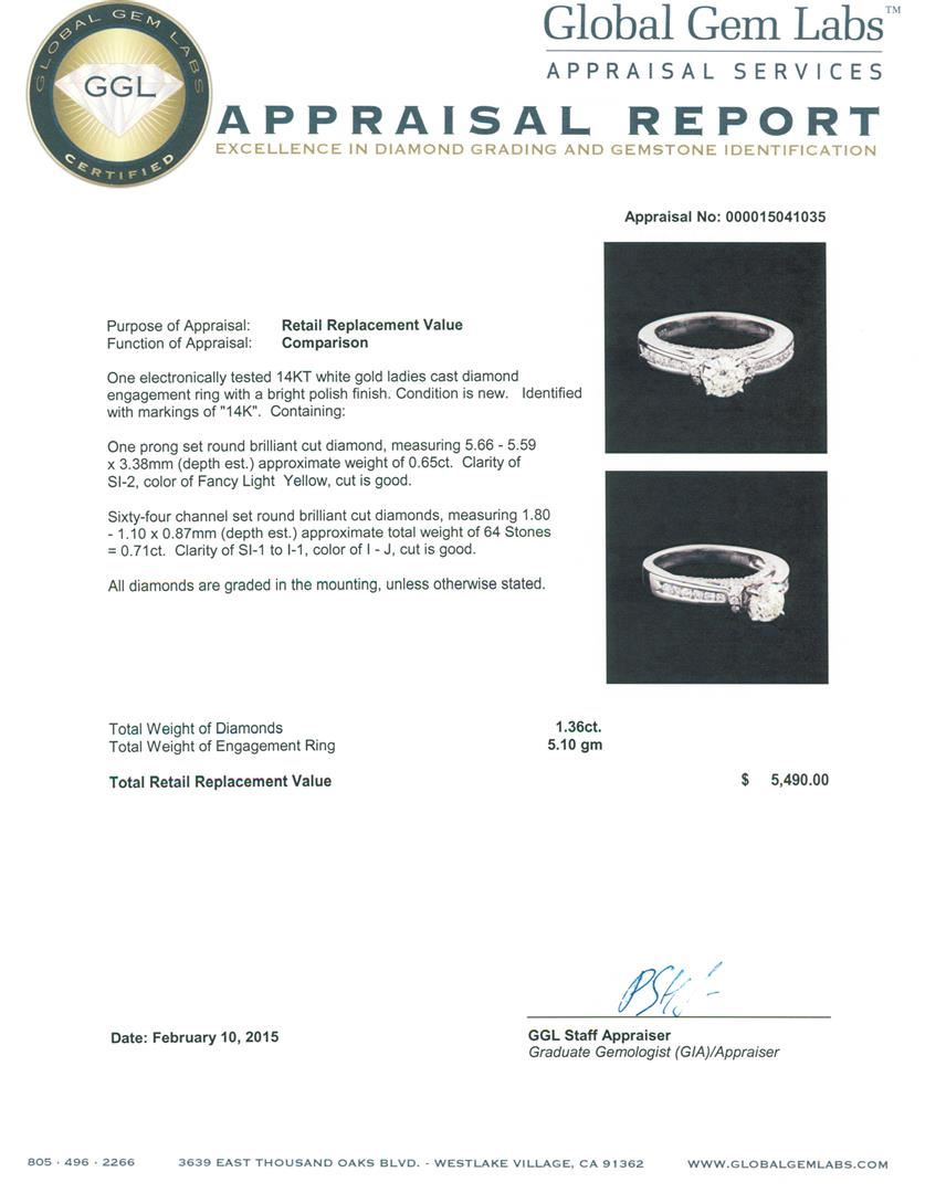 One electronically tested 14KT white gold ladies cast diamond engagement ring with a bright polish finish. Identified with markings of "14K". Condition is new. Containing: One prong set round brilliant cut diamond, measuring 5.66 - 5.59 x 3.38mm (depth est.) approximate weight of 0.65ct. Clarity: SI-2, Cut is Good. Sixty-Four channel set round brilliant cut diamonds, measuring 1.80 - 1.10 x 0.87mm (depth est.) approximate total weight of 64 Stones = 0.71ct. Clarity: SI-1 to I-1. Color: I - J, Cut is Good. All diamonds are graded in the mounting, unless otherwise stated. Total Weight of Diamonds 1.36ct. Total Weight of Engagement Ring 5.10 grams. GGL Appraised at $5,490.00.