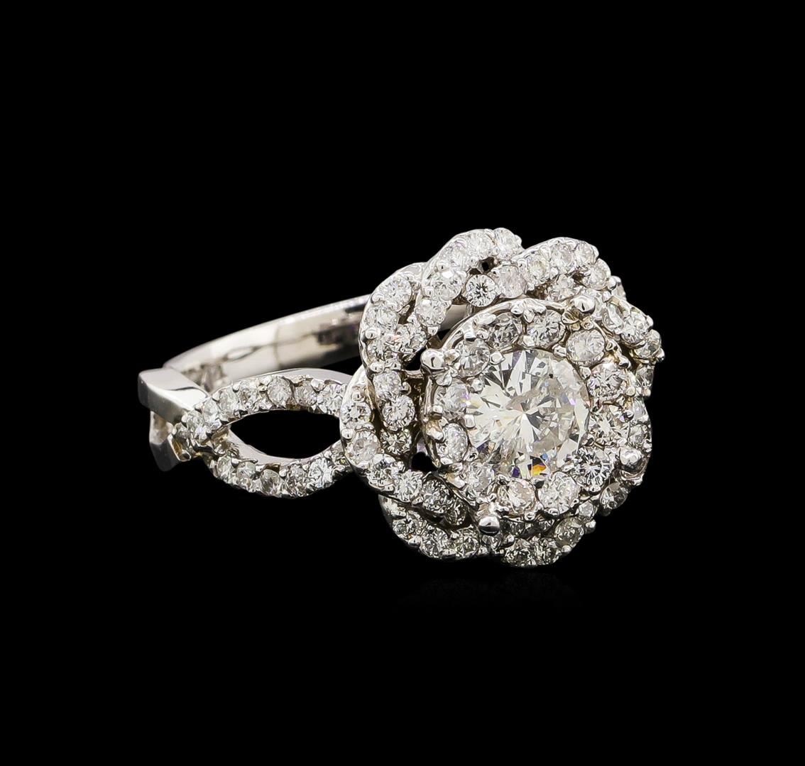 One electronically tested 14KT white gold ladies cast diamond engagement ring with a bright polish finish. Identified with markings of "k14". Condition is new. Containing: One prong set round brilliant cut diamond, measuring 5.50 - 5.50 x 3.30mm (depth est.) approximate weight of 0.61ct. Clarity: I-2. Color: J. Ninety-Five prong set round brilliant cut diamonds, measuring 1.30 - 1.30 x 0.78mm (depth est.) approximate total weight of 95 Stones = 0.76ct. Clarity: SI-2 to I-2. Color: I - J. All diamonds are graded in the mounting, unless otherwise stated. Total Weight of Diamonds 1.37ct. Total Weight of Engagement Ring 6.30 grams. GGL Appraised at $6,185.00.