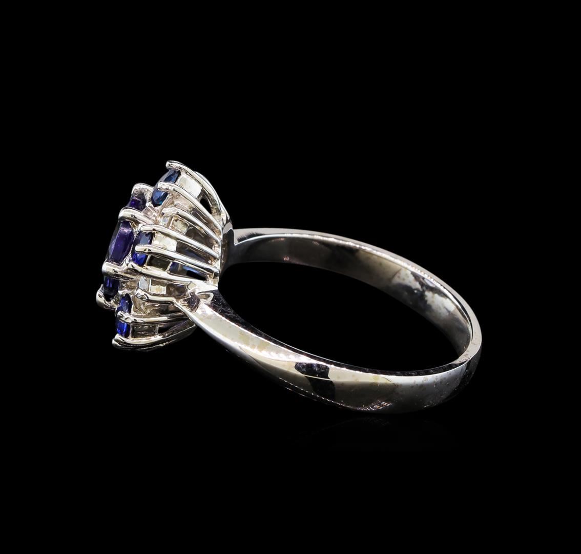 One electronically tested 14KT white gold ladies cast tanzanite, sapphire and diamond ring with a bright polish finish. Identified with markings of "14K". Condition is new. Containing: One prong set round modified brilliant cut natural tanzanite, measuring 6.80 - 6.80 x 4.42 mm, approximate weight of 1.37ct., clarity is eye clean, type I, light, very slightly grayish, violet color, (GIA V 3/3), cut is good. Six prong set round modified brilliant cut natural blue sapphires, measuring 4.00. - 4.00. x 2.60 mm, approximate total weight of 1.98ct., clarity is slightly included, type II, medium, moderately strong, blue color, (GIA B 5/4), cut is good. Six prong set round brilliant cut diamonds, measuring 2.50 - 2.50 x 1.50mm (depth est.) approximate total weight of 6 Stones = 0.34ct. Clarity: SI-1 to SI-2. Color: I - J, Cut is Good. Colored gemstones are presumed to have been subjected to commonly used enhancement processes. All diamonds and colored gemstones are graded in the mounting, unless otherwise stated. Total Weight of Colored Stones 3.35ct. Total Weight of Diamonds 0.34ct. Total Weight of Ring 4.60 grams. GGL Appraised at $3,200.00.