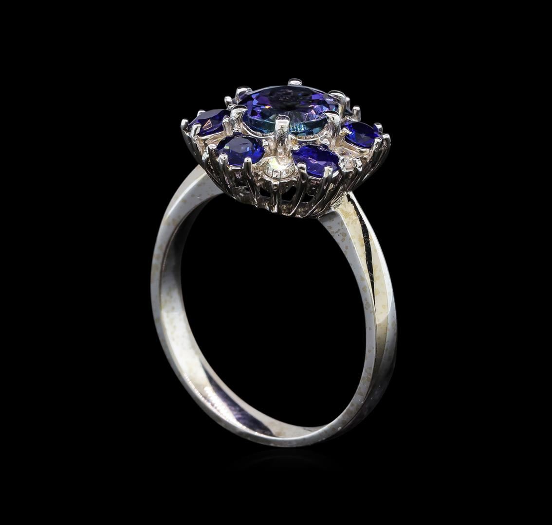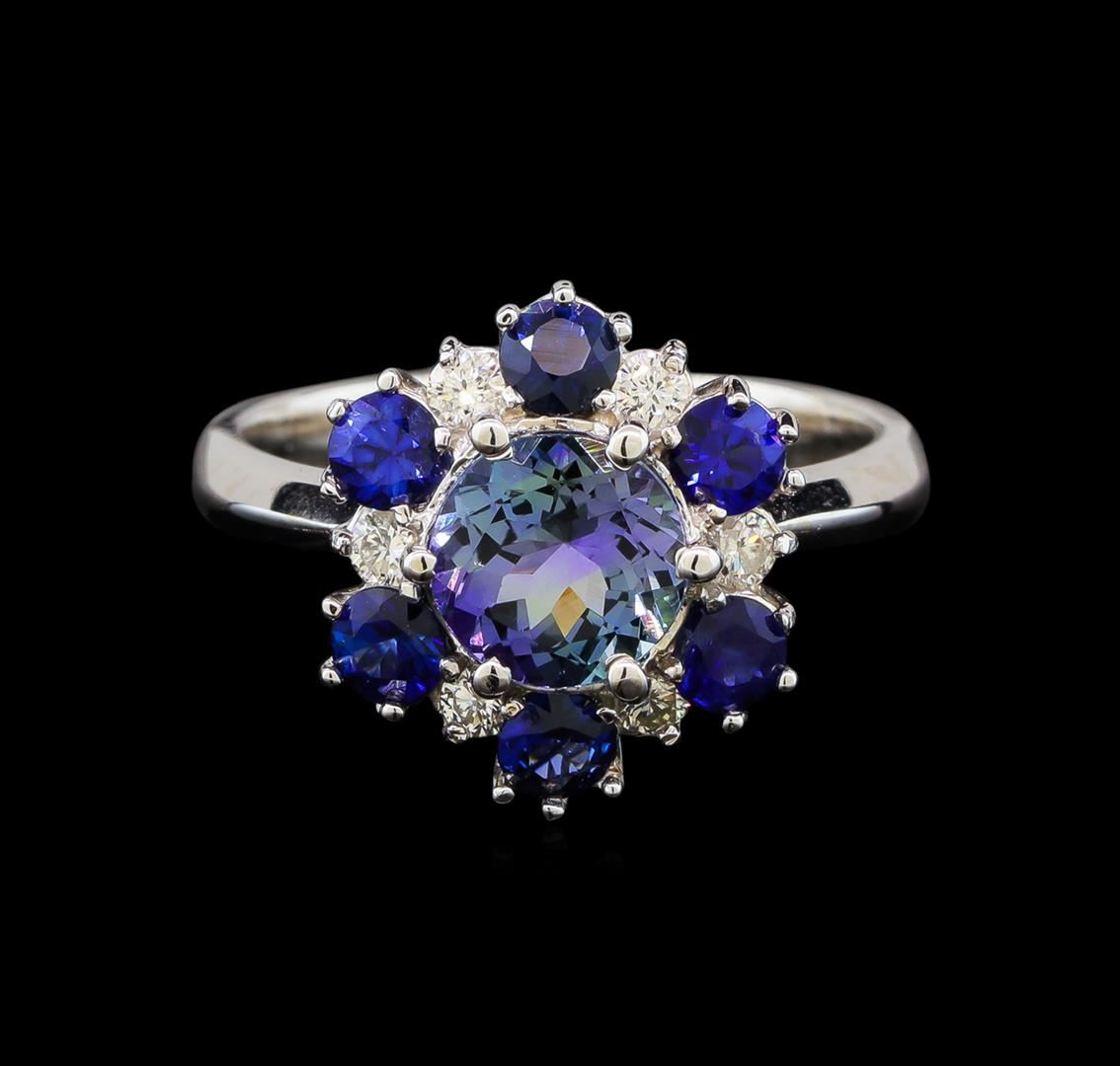 One electronically tested 14KT white gold ladies cast tanzanite, sapphire and diamond ring with a bright polish finish. Identified with markings of "14K". Condition is new. Containing: One prong set round modified brilliant cut natural tanzanite, measuring 6.80 - 6.80 x 4.42 mm, approximate weight of 1.37ct., clarity is eye clean, type I, light, very slightly grayish, violet color, (GIA V 3/3), cut is good. Six prong set round modified brilliant cut natural blue sapphires, measuring 4.00. - 4.00. x 2.60 mm, approximate total weight of 1.98ct., clarity is slightly included, type II, medium, moderately strong, blue color, (GIA B 5/4), cut is good. Six prong set round brilliant cut diamonds, measuring 2.50 - 2.50 x 1.50mm (depth est.) approximate total weight of 6 Stones = 0.34ct. Clarity: SI-1 to SI-2. Color: I - J, Cut is Good. Colored gemstones are presumed to have been subjected to commonly used enhancement processes. All diamonds and colored gemstones are graded in the mounting, unless otherwise stated. Total Weight of Colored Stones 3.35ct. Total Weight of Diamonds 0.34ct. Total Weight of Ring 4.60 grams. GGL Appraised at $3,200.00.