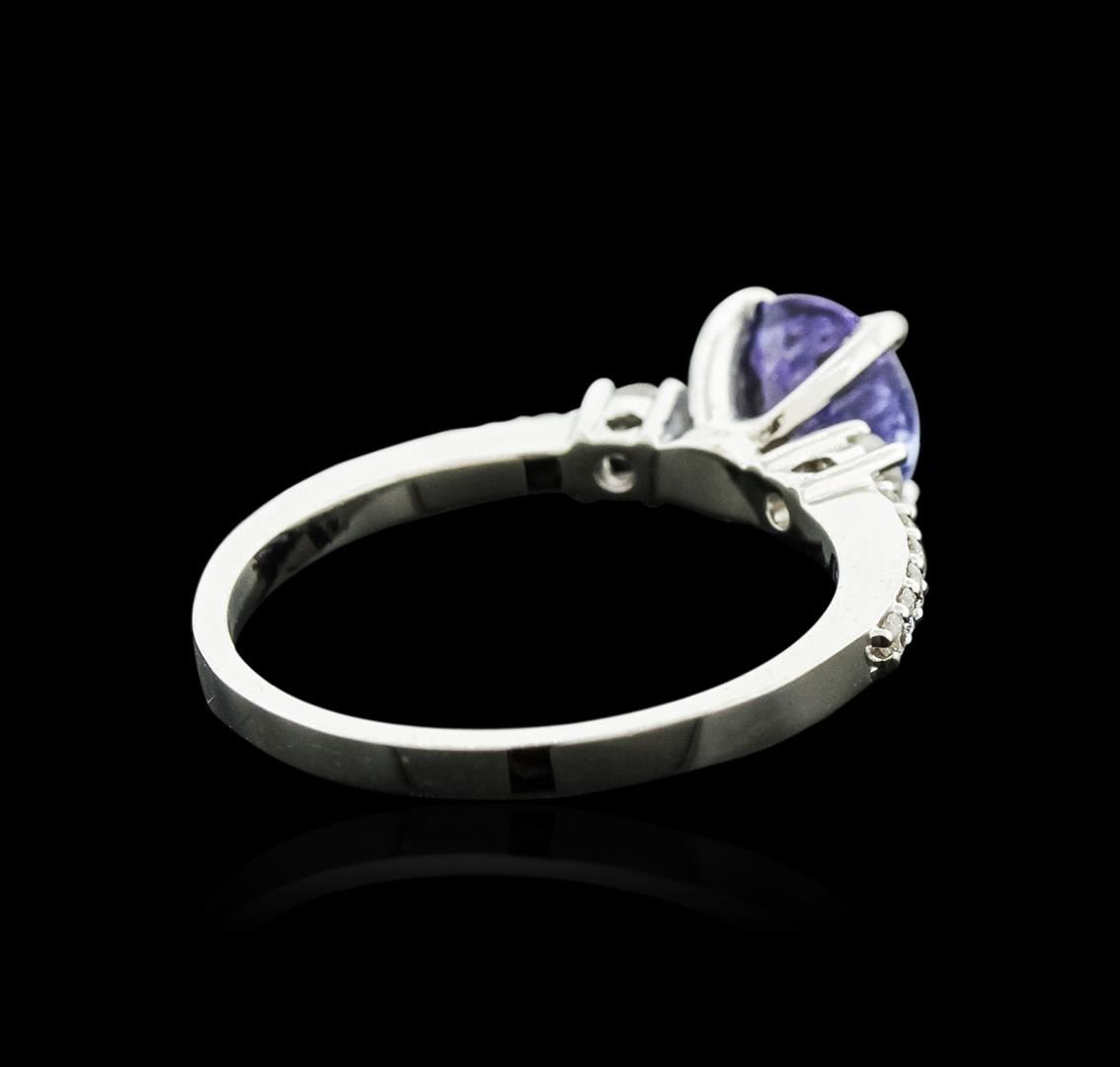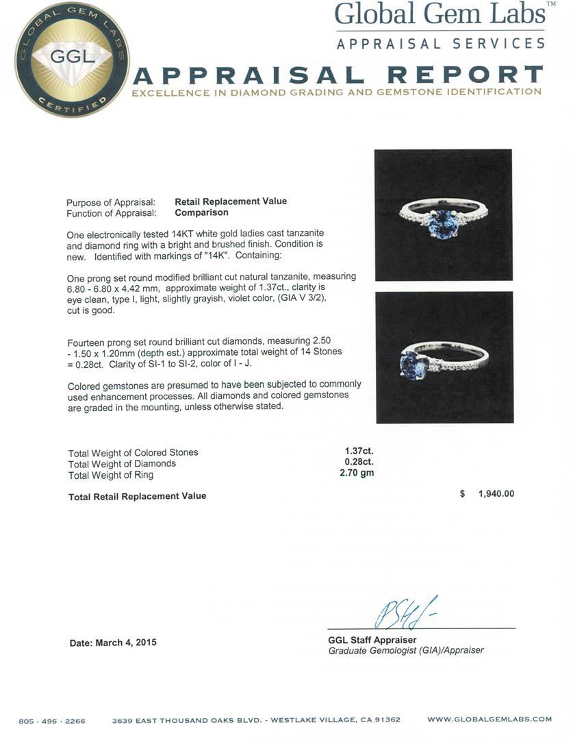 One electronically tested 14KT white gold ladies cast tanzanite and diamond ring with a bright and brushed finish. Identified with markings of "14K". Condition is new. Containing: One prong set round modified brilliant cut natural tanzanite, measuring 6.80 - 6.80 x 4.42 mm, approximate weight of 1.37ct., clarity is eye clean, type I, light, slightly grayish, violet color, (GIA V 3/2), cut is good. Fourteen prong set round brilliant cut diamonds, measuring 2.50 - 1.50 x 1.20mm (depth est.) approximate total weight of 14 Stones = 0.28ct. Clarity: SI-1 to SI-2. Color: I - J. Colored gemstones are presumed to have been subjected to commonly used enhancement processes. All diamonds and colored gemstones are graded in the mounting, unless otherwise stated. Total Weight of Colored Stones 1.37ct. Total Weight of Diamonds 0.28ct. Total Weight of Ring 2.70 grams. GGL Appraised at $1,940.00.