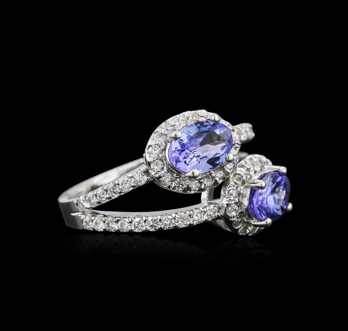 One electronically tested 14KT white gold ladies cast tanzanite and diamond ring with a split shoulder shank with a bright polish finish. Identified with markings of "K14". Condition is new. Containing: Two prong set oval modified brilliant cut natural tanzanites, measuring 6.86 x 4.92 x 2.77mm, exact total weight 1.37ct., clarity is eye clean, type I, medium light, very slightly grayish, violet color, (GIA V 4/3), cut is good. Sixty-Four prong set round brilliant cut diamonds, measuring 1.30 - 1.30 x 0.78mm (depth est.) approximate total weight of 64 Stones = 0.66ct. Clarity: SI-2 to I-2. Color: H - I, Cut is Good. All diamonds and colored gemstones are graded in the mounting, unless otherwise stated. Colored gemstones are presumed to have been subjected to commonly used enhancement processes. Total Weight of Colored Stones 1.37ct. Total Weight of Diamonds 0.66ct. Total Weight of Ring 4.80 grams. GGL Appraised at $2,485.00.