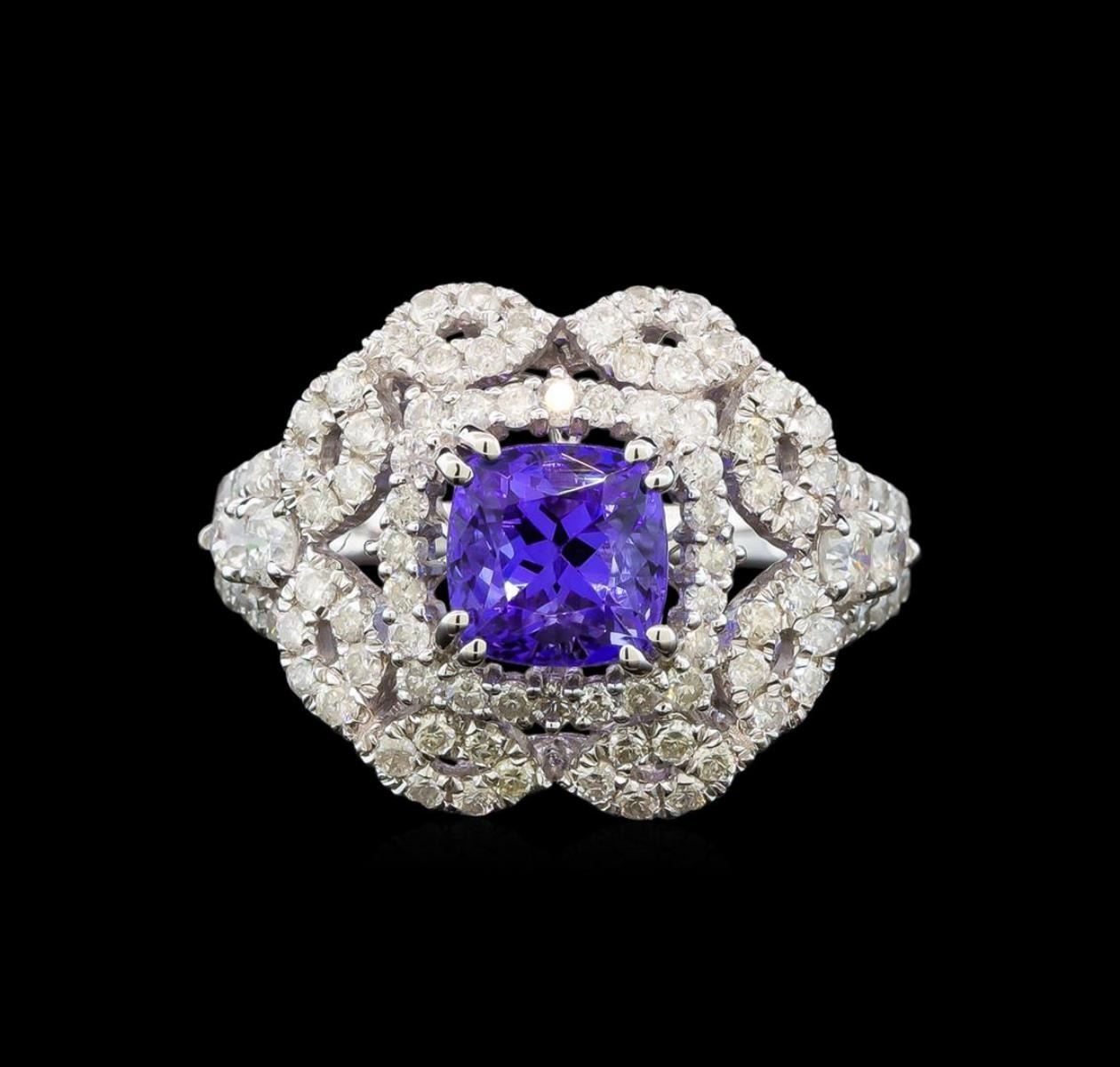 One electronically tested 14KT white gold ladies cast tanzanite and diamond ring with a bright polish finish. Identified with markings of "14K". Condition is new. Containing: One prong set square cushion modified brilliant cut natural tanzanite, measuring 6.48 x 6.41 x 4.19mm, approximate weight of 1.37ct., clarity is eye clean, type I, medium light, very slightly grayish, violet color, (GIA V 4/3), cut is good. Ninety-Six prong set round brilliant cut diamonds, measuring 2.10 - 1.30 x 1.02mm (depth est.) approximate total weight of 96 Stones = 0.70 ct. Clarity: I-1 to I-2. Color: I - J. Colored gemstones are presumed to have been subjected to commonly used enhancement processes. All diamonds and colored gemstones are graded in the mounting, unless otherwise stated. Total Weight of Colored Stones 1.37ct. Total Weight of Diamonds 0.70 ct. Total Weight of Ring 5.30 grams. GGL Appraised.