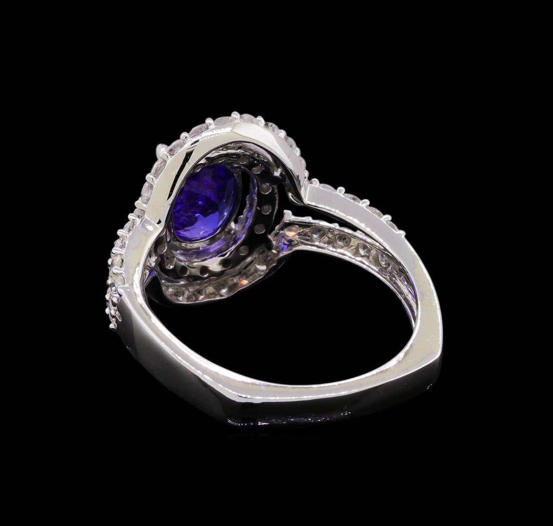One electronically tested 14KT white gold ladies cast tanzanite and diamond ring with a bright polish finish. The featured tanzanite is set within two tiered diamond bezels supported by diamond set split shoulders, completed by a two and one-half millimeter wide band. Trademark is Orianne. Identified with markings of "14K". Condition is new, good workmanship. Containing: One prong set oval brilliant cut natural tanzanite, measuring 8.20 x 5.60 x 4.05mm, 6% bulge factor, approximate weight of 1.37ct., clarity is eye clean, type I, medium dark, very slightly grayish, violetish blue color, (GIA vB 6/3), cut is good. Transmitting light with no distortion, transparent. Graded in the setting. Tanzanite is a very rare gemstone that is only found in the country of Tanzania. Originally discovered in 1967. Tiffany & Company, named the stone Tanzanite. It is found in the Usumburu Mountains that border the Umba Valley of northern Tanzania. Tanzanite occurs in gray, brown, violet, blue, reddish-purple, & green. The gem is interesting because of its exceptional pleochroism. Rotated in different directions a tanzanite will exhibit multiple changes of color. Tanzanite has a low tolerance to ultrasonic cleaning, and should not be cleaned using this method. Fifty-Four prong set round brilliant cut diamonds, measuring 1.70 - 1.60 x 0.99mm (depth est.) approximate total weight of 54 Stones = 0.98ct. Graded in the setting. Clarity: SI-2 to I-1. Color: G - I. Total Weight of Colored Stones 1.37ct. Total Weight of Diamonds 0.98ct. Total Weight of Ring 4.36 grams. AIG Appraised.