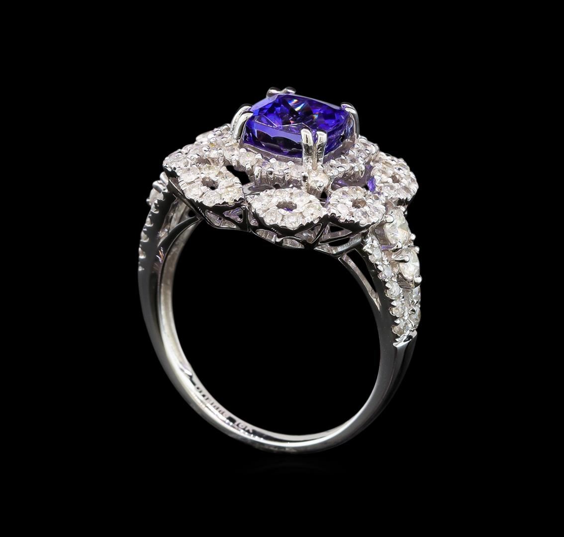 One electronically tested 14KT white gold ladies cast tanzanite and diamond ring with a bright polish finish. Identified with markings of "14K". Condition is new. Containing: One prong set square cushion modified brilliant cut natural tanzanite, measuring 6.48 x 6.41 x 4.19mm, approximate weight of 1.37ct., clarity is eye clean, type I, medium light, very slightly grayish, violet color, (GIA V 4/3), cut is good. Ninety-Six prong set round brilliant cut diamonds, measuring 2.10 - 1.30 x 1.02mm (depth est.) approximate total weight of 96 Stones = 0.70 ct. Clarity: I-1 to I-2. Color: I - J. Colored gemstones are presumed to have been subjected to commonly used enhancement processes. All diamonds and colored gemstones are graded in the mounting, unless otherwise stated. Total Weight of Colored Stones 1.37ct. Total Weight of Diamonds 0.70 ct. Total Weight of Ring 5.30 grams. GGL Appraised.