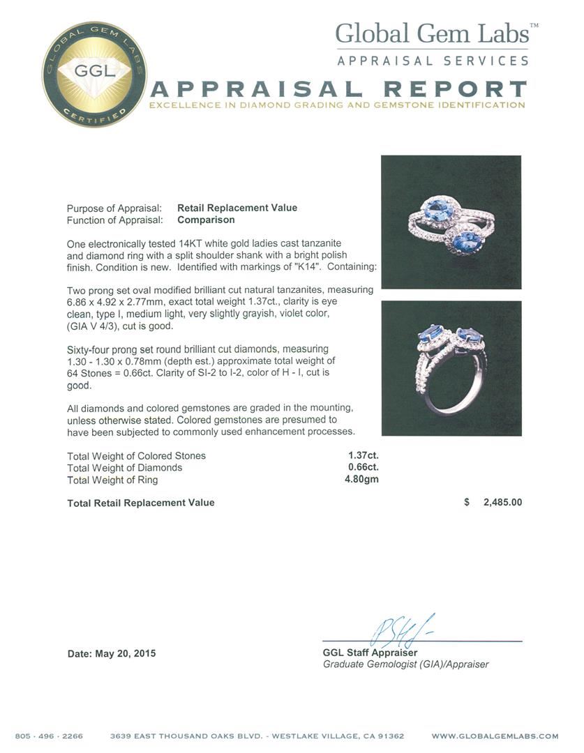 One electronically tested 14KT white gold ladies cast tanzanite and diamond ring with a split shoulder shank with a bright polish finish. Identified with markings of "K14". Condition is new. Containing: Two prong set oval modified brilliant cut natural tanzanites, measuring 6.86 x 4.92 x 2.77mm, exact total weight 1.37ct., clarity is eye clean, type I, medium light, very slightly grayish, violet color, (GIA V 4/3), cut is good. Sixty-Four prong set round brilliant cut diamonds, measuring 1.30 - 1.30 x 0.78mm (depth est.) approximate total weight of 64 Stones = 0.66ct. Clarity: SI-2 to I-2. Color: H - I, Cut is Good. All diamonds and colored gemstones are graded in the mounting, unless otherwise stated. Colored gemstones are presumed to have been subjected to commonly used enhancement processes. Total Weight of Colored Stones 1.37ct. Total Weight of Diamonds 0.66ct. Total Weight of Ring 4.80 grams. GGL Appraised.