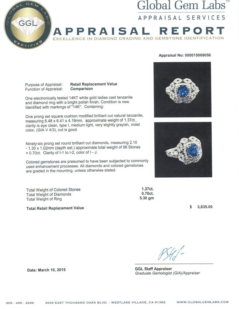 One electronically tested 14KT white gold ladies cast tanzanite and diamond ring with a bright polish finish. Identified with markings of "14K". Condition is new. Containing: One prong set square cushion modified brilliant cut natural tanzanite, measuring 6.48 x 6.41 x 4.19mm, approximate weight of 1.37ct., clarity is eye clean, type I, medium light, very slightly grayish, violet color, (GIA V 4/3), cut is good. Ninety-Six prong set round brilliant cut diamonds, measuring 2.10 - 1.30 x 1.02mm (depth est.) approximate total weight of 96 Stones = 0.70ct. Clarity: I-1 to I-2. Color: I - J. Colored gemstones are presumed to have been subjected to commonly used enhancement processes. All diamonds and colored gemstones are graded in the mounting, unless otherwise stated. Total Weight of Colored Stones 1.37ct. Total Weight of Diamonds 0.70ct. Total Weight of Ring 5.30 grams. GGL Appraised at $3,635.00.