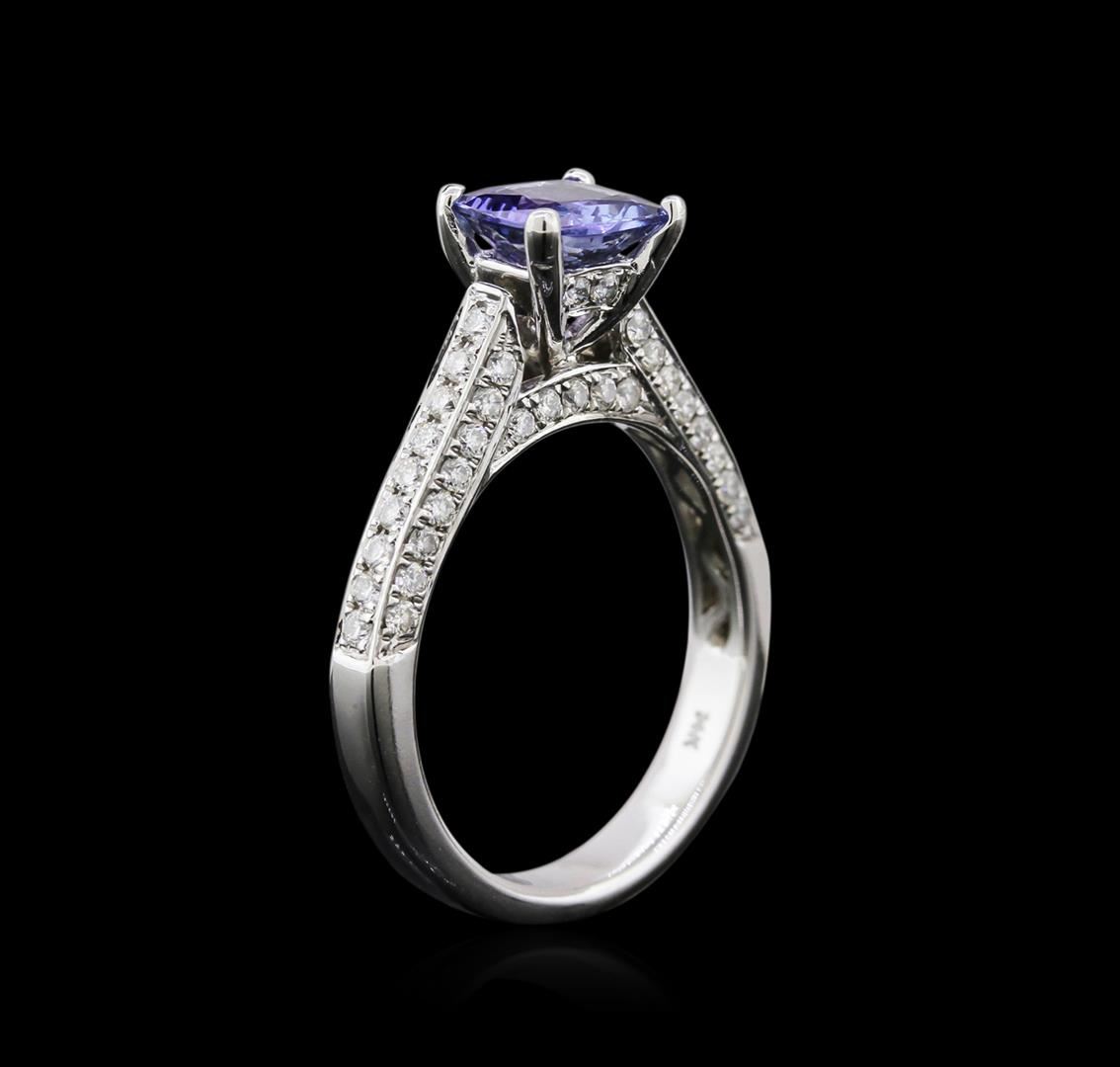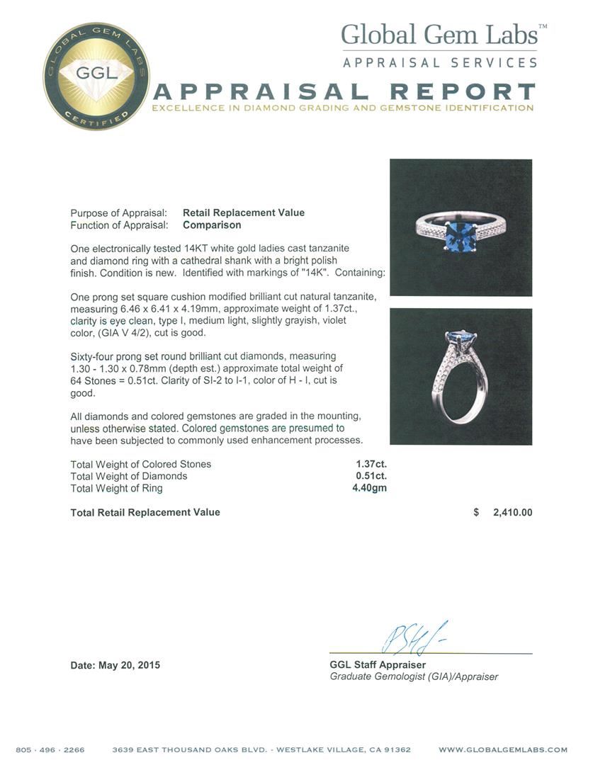 One electronically tested 14KT white gold ladies cast tanzanite and diamond ring with a cathedral shank with a bright polish finish. Identified with markings of "14K". Condition is new. Containing: One prong set square cushion modified brilliant cut natural tanzanite, measuring 6.46 x 6.41 x 4.19mm, approximate weight of 1.37ct., clarity is eye clean, type I, medium light, slightly grayish, violet color, (GIA V 4/2), cut is good. Sixty-Four prong set round brilliant cut diamonds, measuring 1.30 - 1.30 x 0.78mm (depth est.) approximate total weight of 64 Stones = 0.51ct. Clarity: SI-2 to I-1. Color: H - I, Cut is Good. All diamonds and colored gemstones are graded in the mounting, unless otherwise stated. Colored gemstones are presumed to have been subjected to commonly used enhancement processes. Total Weight of Colored Stones 1.37ct. Total Weight of Diamonds 0.51ct. Total Weight of Ring 4.40 grams. GGL Appraised at $2,410.00.