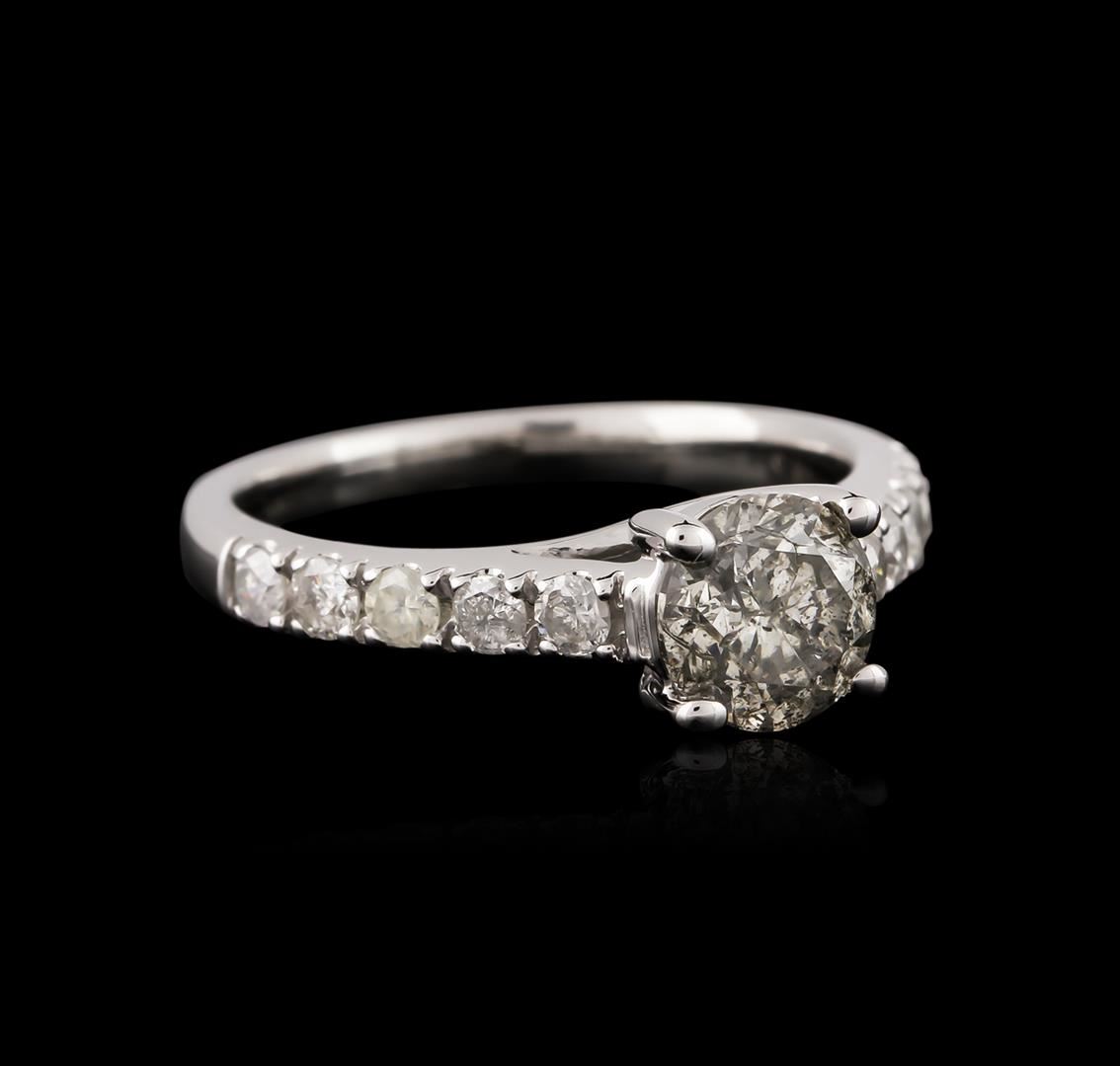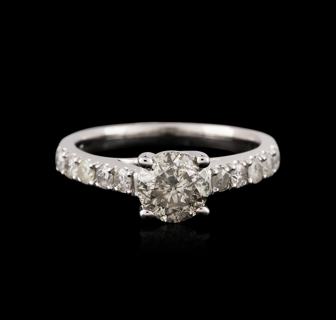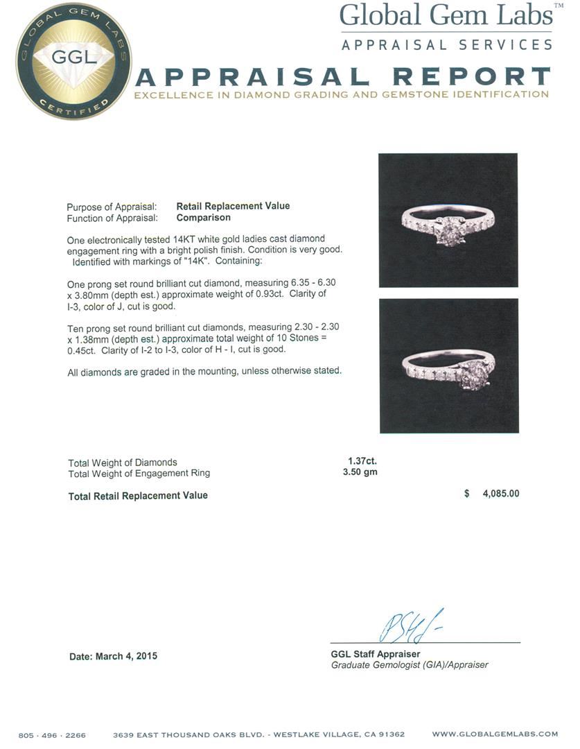 One electronically tested 14KT white gold ladies cast diamond engagement ring with a bright polish finish. Identified with markings of "14K". Condition is very good. Containing: One prong set round brilliant cut diamond, measuring 6.35 - 6.30 x 3.80mm (depth est.) approximate weight of 0.93ct. Clarity: I-3. Color: J, Cut is Good. Ten prong set round brilliant cut diamonds, measuring 2.30 - 2.30 x 1.38mm (depth est.) approximate total weight of 10 Stones = 0.45ct. Clarity: I-2 to I-3. Color: H - I, Cut is Good. All diamonds are graded in the mounting, unless otherwise stated. Total Weight of Diamonds 1.37ct. Total Weight of Engagement Ring 3.50 grams. GGL Appraised at $4,085.00.