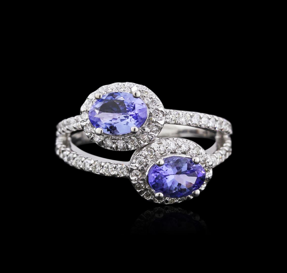 One electronically tested 14KT white gold ladies cast tanzanite and diamond ring with a split shoulder shank with a bright polish finish. Identified with markings of "K14". Condition is new. Containing: Two prong set oval modified brilliant cut natural tanzanites, measuring 6.86 x 4.92 x 2.77mm, exact total weight 1.37ct., clarity is eye clean, type I, medium light, very slightly grayish, violet color, (GIA V 4/3), cut is good. Sixty-Four prong set round brilliant cut diamonds, measuring 1.30 - 1.30 x 0.78mm (depth est.) approximate total weight of 64 Stones = 0.66ct. Clarity: SI-2 to I-2. Color: H - I, Cut is Good. All diamonds and colored gemstones are graded in the mounting, unless otherwise stated. Colored gemstones are presumed to have been subjected to commonly used enhancement processes. Total Weight of Colored Stones 1.37ct. Total Weight of Diamonds 0.66ct. Total Weight of Ring 4.80 grams. GGL Appraised at $2,485.00.