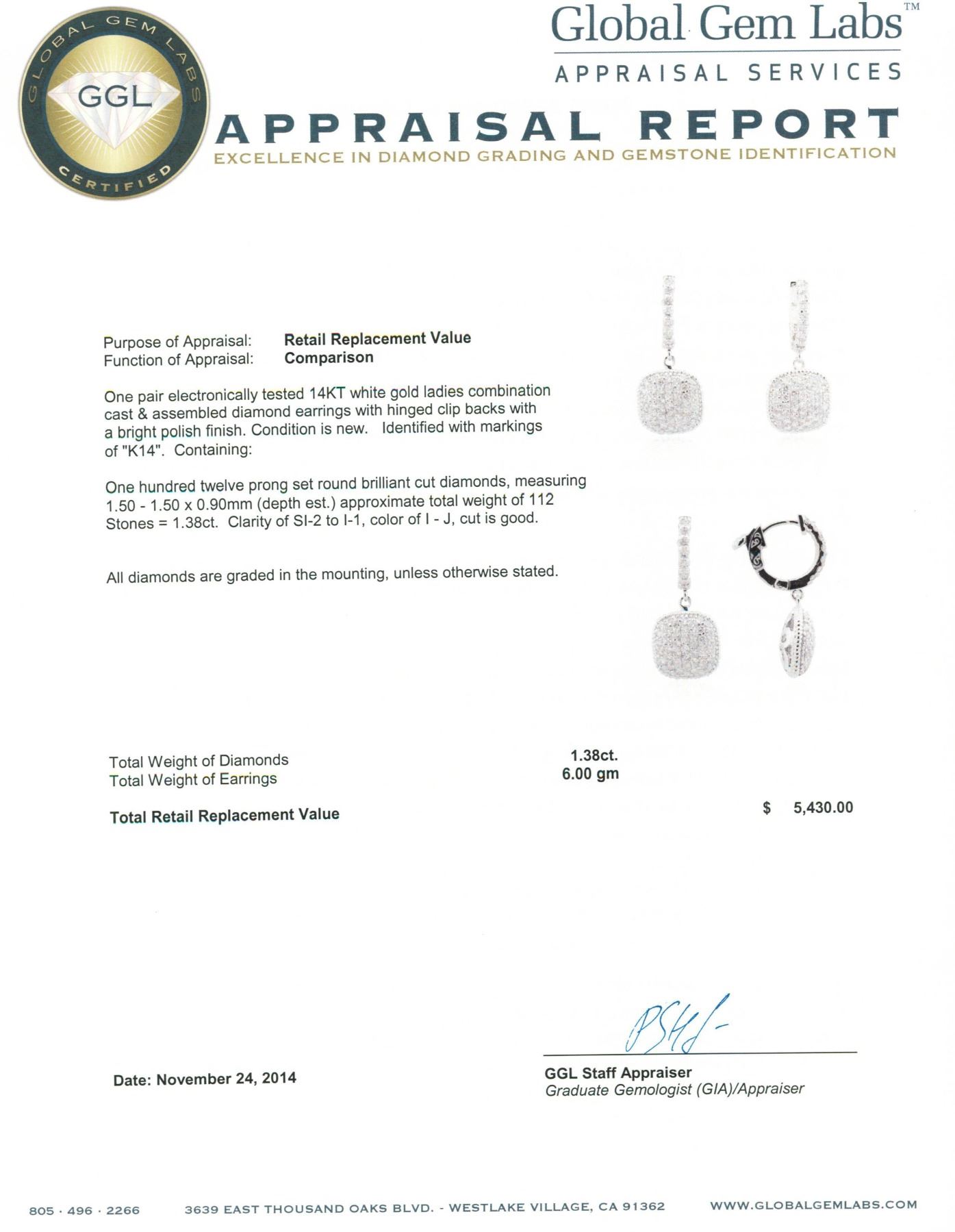 One pair electronically tested 14KT white gold ladies combination cast & assembled diamond earrings with hinged clip backs with a bright polish finish. Identified with markings of "K14". Condition is new. Containing: One Hundred Twelve prong set round brilliant cut diamonds, measuring 1.50 - 1.50 x 0.90mm (depth est.) approximate total weight of 112 Stones = 1.38ct. Clarity: SI-2 to I-1. Color: I - J, Cut is Good. All diamonds are graded in the mounting, unless otherwise stated. Total Weight of Diamonds 1.38ct. Total Weight of Earrings 6.00 grams. GGL Appraised.