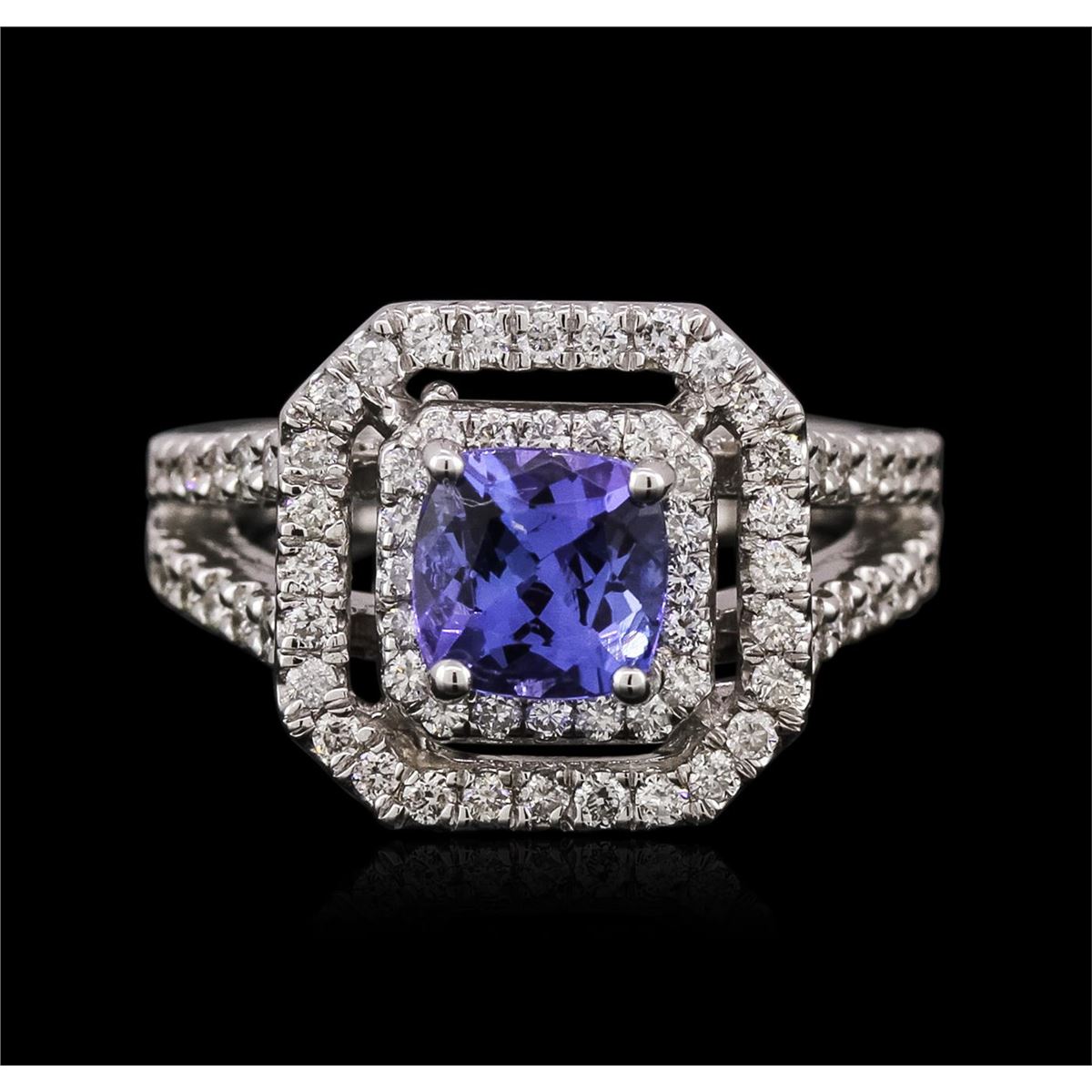 One electronically tested 14KT white gold ladies cast tanzanite and diamond ring with a bright polish finish. Identified with markings of "14KT". Condition is new. Containing: One prong set square cushion modified brilliant cut natural tanzanite, measuring 6.49 x 6.43 x 4.20mm, approximate weight of 1.38ct., clarity is eye clean, type I, medium, very slightly grayish, violet color, (GIA V 5/3), cut is very good. Seventy-Two prong set round brilliant cut diamonds, measuring 1.30 - 1.30 x 0.78mm (depth est.) approximate total weight of 72 Stones = 0.58ct. Clarity: SI-1 to SI-2. Color: J - K, Cut is Good. Colored gemstones are presumed to have been subjected to commonly used enhancement processes. All diamonds and colored gemstones are graded in the mounting, unless otherwise stated. Total Weight of Colored Stones 1.38ct. Total Weight of Diamonds 0.58ct. Total Weight of Ring 7.90 grams. GGL Appraised at $4,575.00.