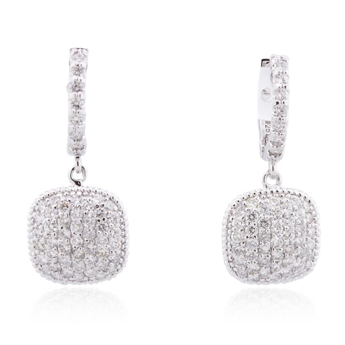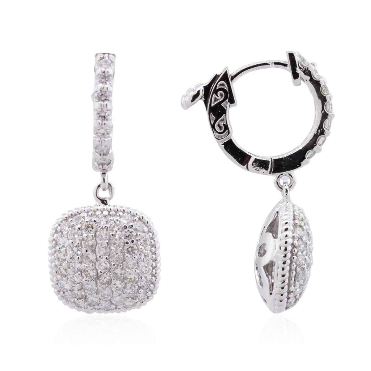 One pair electronically tested 14KT white gold ladies combination cast & assembled diamond earrings with hinged clip backs with a bright polish finish. Identified with markings of "K14". Condition is new. Containing: One Hundred Twelve prong set round brilliant cut diamonds, measuring 1.50 - 1.50 x 0.90mm (depth est.) approximate total weight of 112 Stones = 1.38ct. Clarity: SI-2 to I-1. Color: I - J, Cut is Good. All diamonds are graded in the mounting, unless otherwise stated. Total Weight of Diamonds 1.38ct. Total Weight of Earrings 6.00 grams. GGL Appraised at $5,430.00.