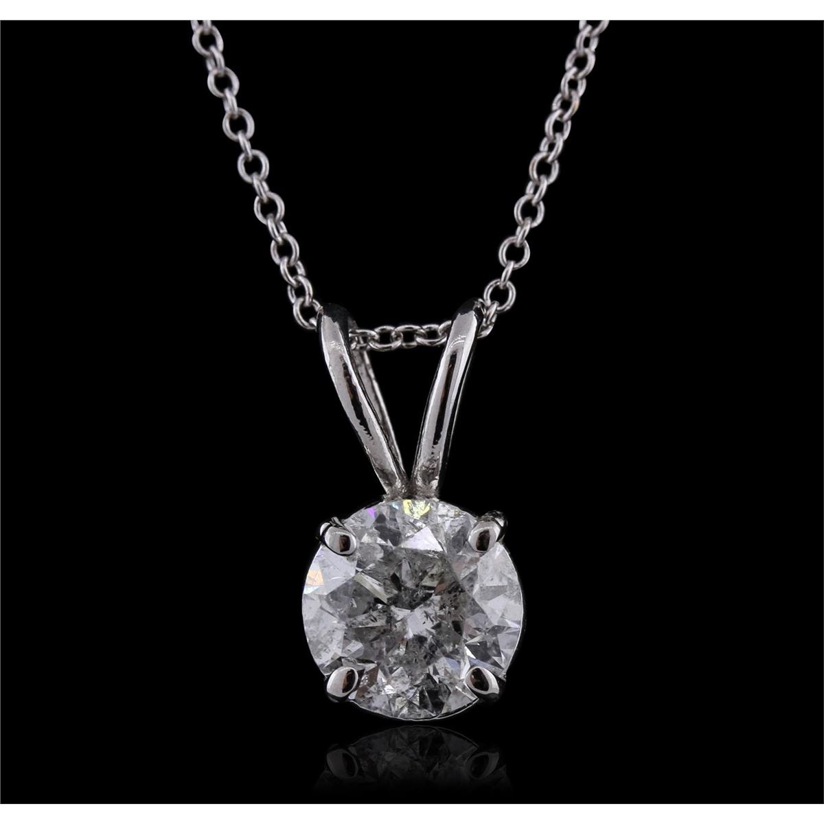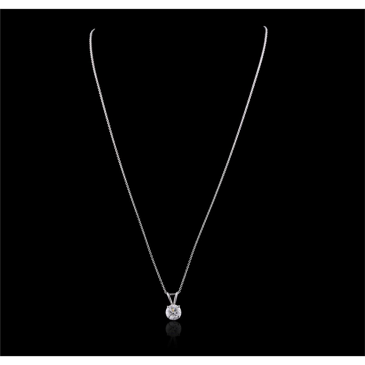One electronically tested 14KT white gold ladies combination cast & die struck solitaire pendant & chain 15.5" long, light cable link with a spring ring clasp with a bright polish finish. Condition is new. Identified with markings of "14K". Containing: One prong set round brilliant cut diamond, measuring 7.00 - 7.00 x 4.60mm (depth est.) approximate weight of 1.38ct. Clarity: I-2. Color: G, Cut is Good. All diamonds are graded in the mounting, unless otherwise stated. Total Weight of Diamonds 1.38ct. Total Weight of Pendant & Chain 2.00 grams. GGL Appraised at $12,915.00.