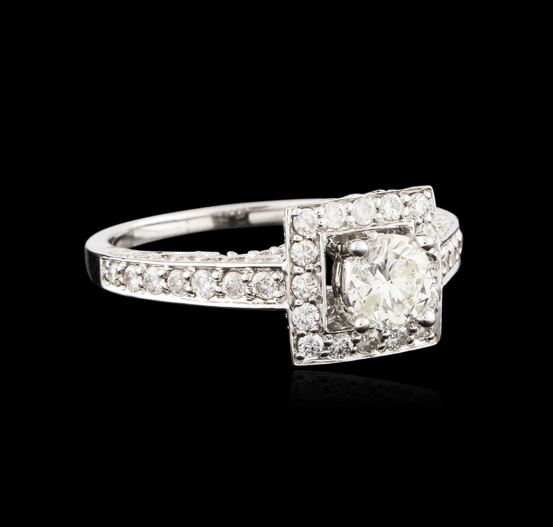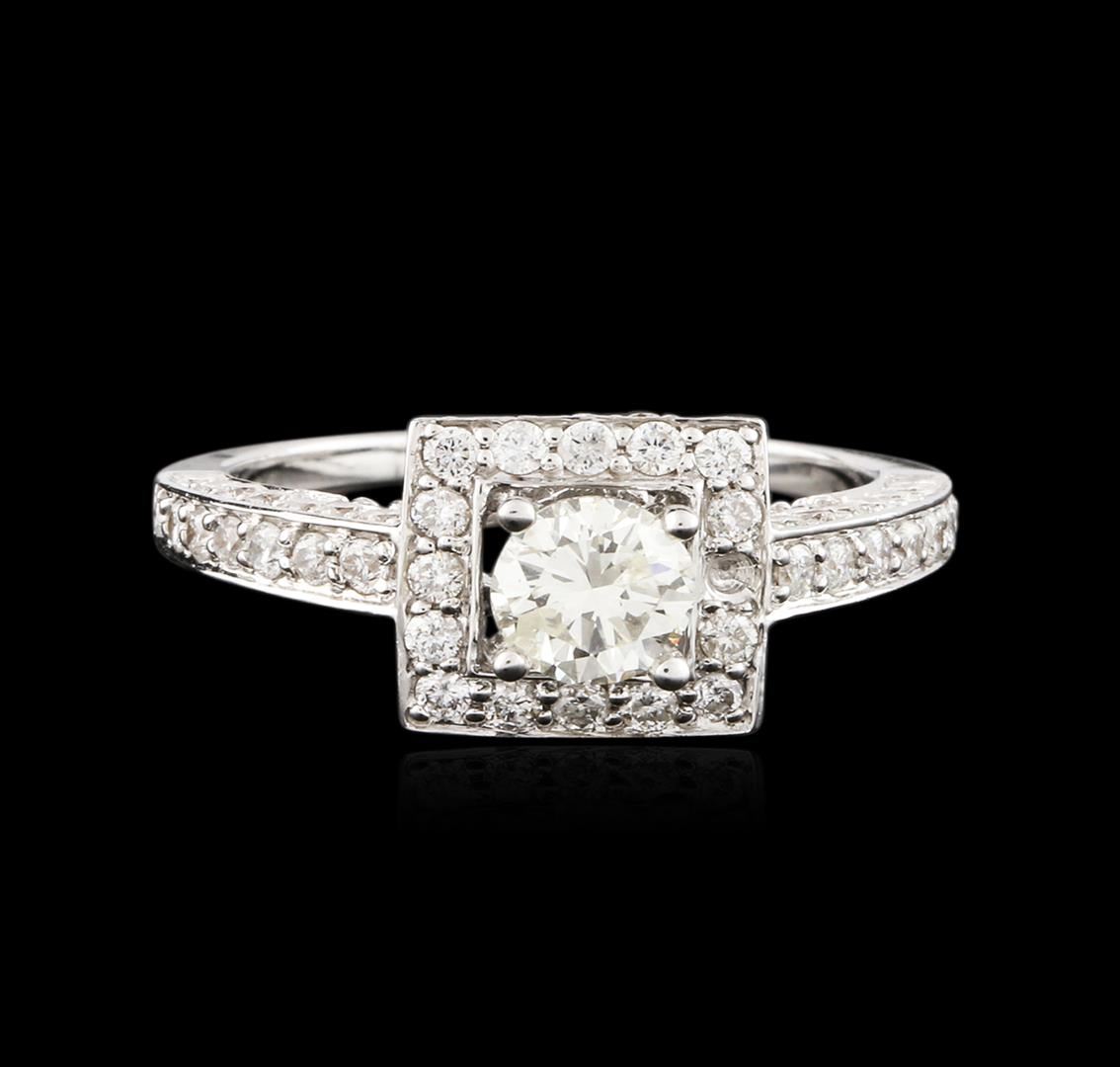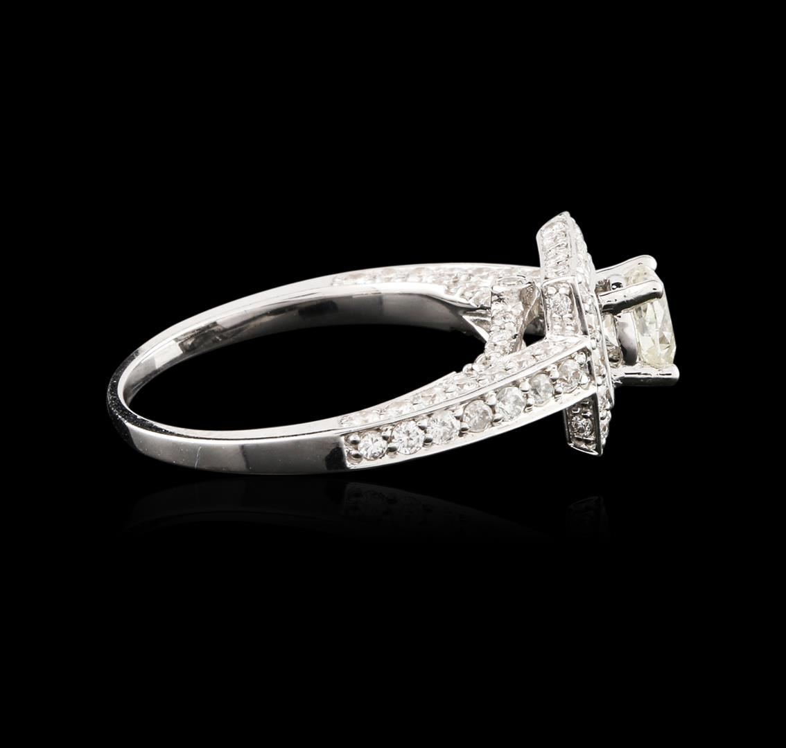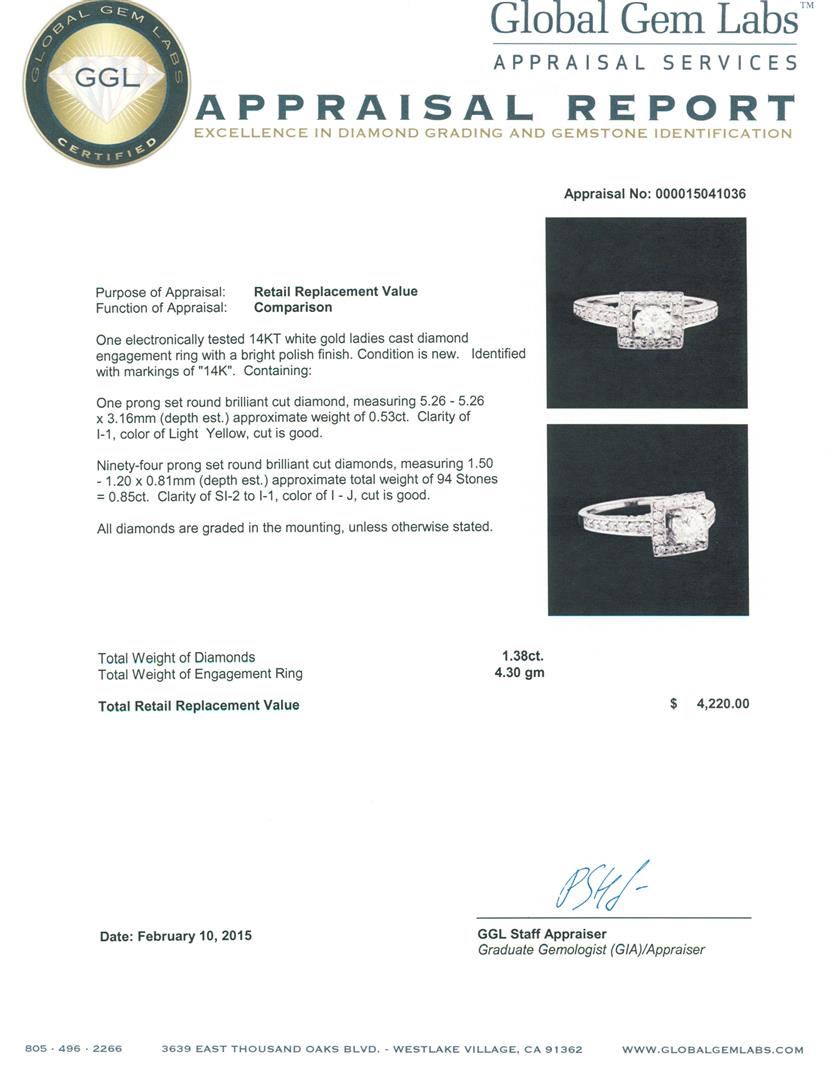 One electronically tested 14KT white gold ladies cast diamond engagement ring with a bright polish finish. Identified with markings of "14K". Condition is new. Containing: One prong set round brilliant cut diamond, measuring 5.26 - 5.26 x 3.16mm (depth est.) approximate weight of 0.53ct. Clarity: I-1, Cut is Good. Ninety-Four prong set round brilliant cut diamonds, measuring 1.50 - 1.20 x 0.81mm (depth est.) approximate total weight of 94 Stones = 0.85ct. Clarity: SI-2 to I-1. Color: I - J, Cut is Good. All diamonds are graded in the mounting, unless otherwise stated. Total Weight of Diamonds 1.38ct. Total Weight of Engagement Ring 4.30 grams. GGL Appraised at $4,220.00.