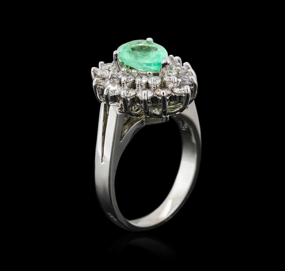 One electronically tested 14KT white gold ladies cast emerald and diamond ring with a split shoulder shank with a bright polish finish. Identified with markings of "K14". Condition is new. Containing: One prong set pear modified brilliant cut natural emerald, measuring 8.38 x 6.86 x 4.46mm, approximate weight of 1.39ct., clarity is moderately included, type III, light, very slightly grayish, very slightly bluish green color, (GIA vslbG 3/3), cut is good. Fifteen prong set round brilliant cut diamonds, measuring 2.10 - 2.10 x 1.26mm (depth est.) approximate total weight of 15 Stones = 0.51ct. Clarity: SI-1 to SI-2. Color: K - L, Cut is Good. Thirteen prong set round brilliant cut diamonds, measuring 1.70 - 1.70 x 1.02mm (depth est.) approximate total weight of 13 Stones = 0.23ct. Clarity: SI-2 to I-1. Color: J - K, Cut is Good. Diamonds and colored gemstones are graded in the mounting, unless otherwise stated. Colored gemstones are presumed to have been subjected to commonly used enhancement processes. Total Weight of Colored Stones 1.39ct. Total Weight of Diamonds 0.74ct. Total Weight of Ring 7.10 grams. GGL Appraised.