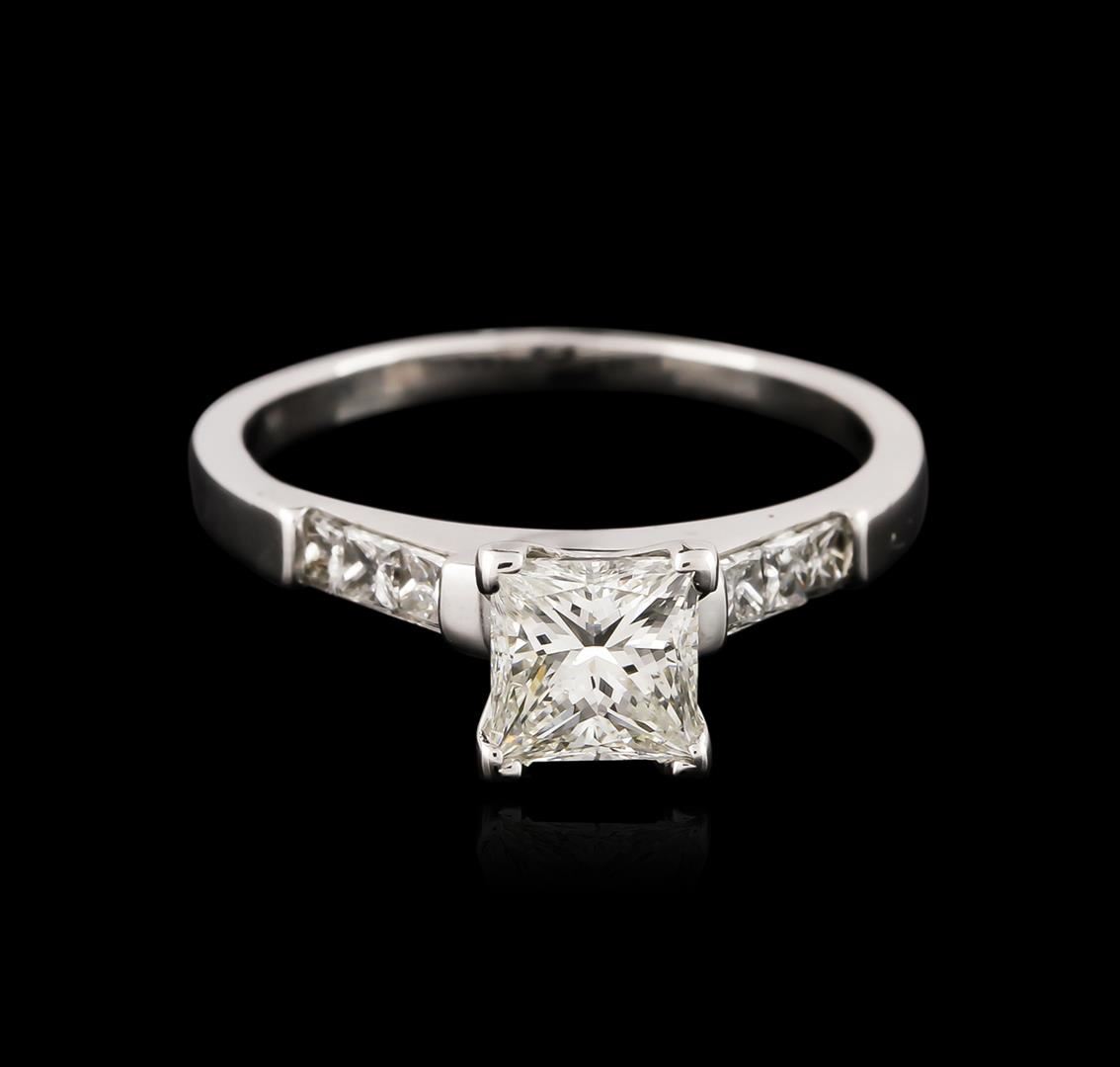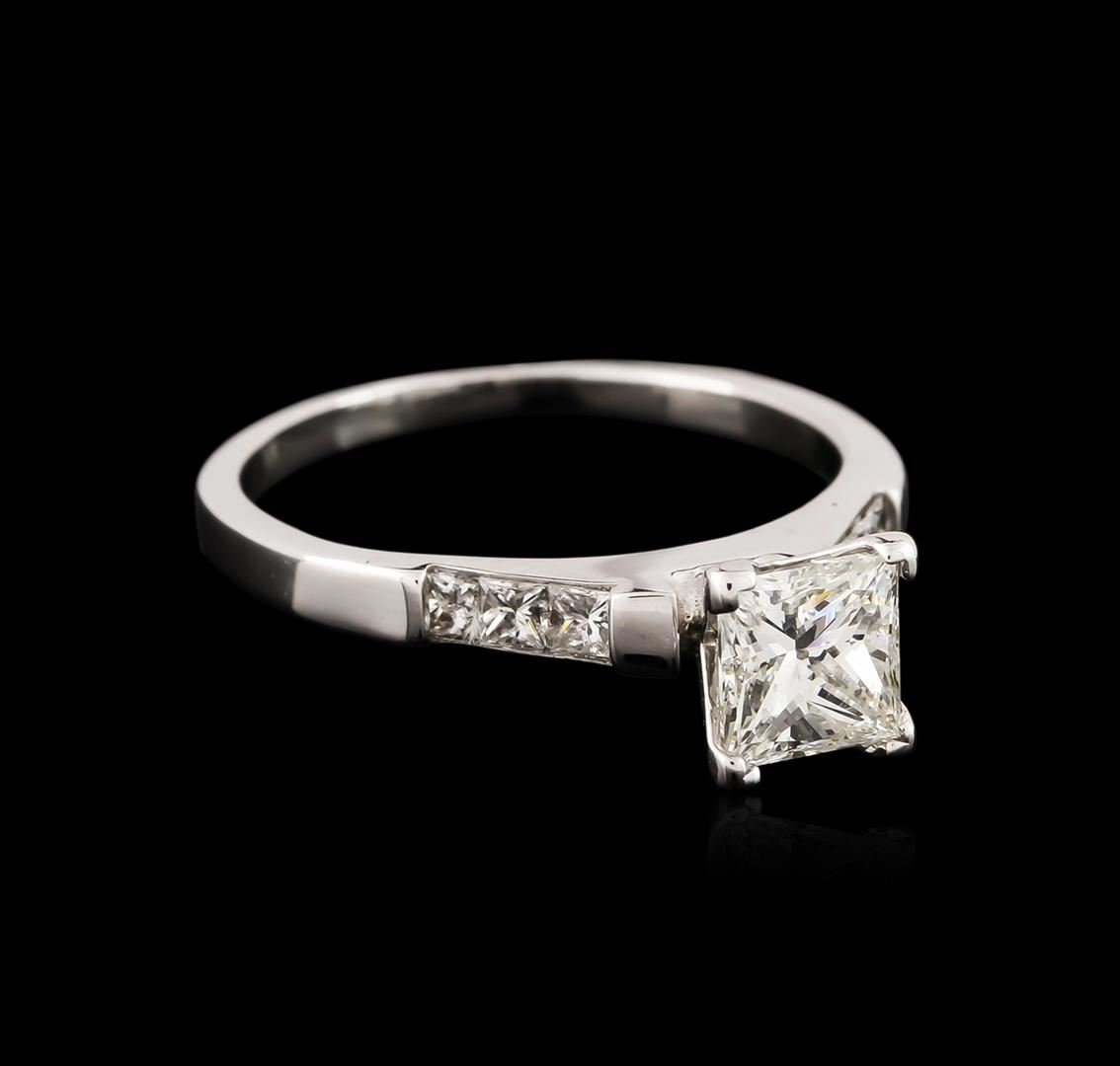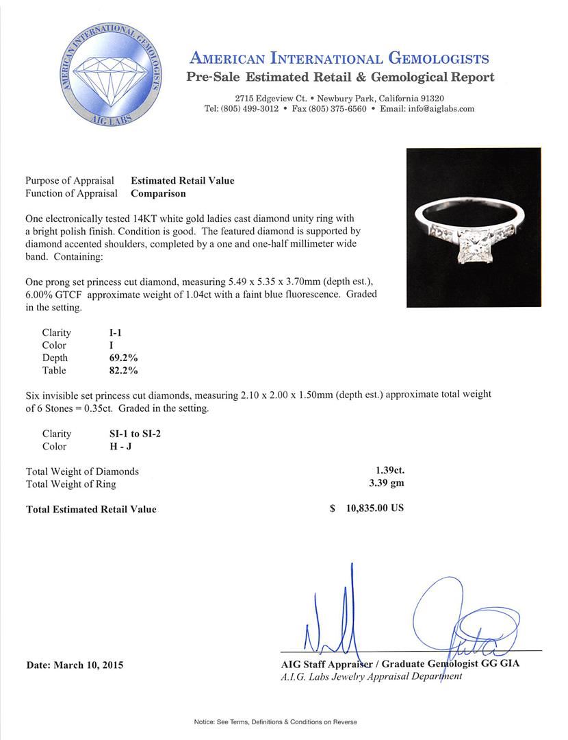 One electronically tested 14KT white gold ladies cast diamond unity ring with a bright polish finish. The featured diamond is supported by diamond accented shoulders, completed by a one and one-half millimeter wide band. Condition is good. Containing: One prong set princess cut diamond, measuring 5.49 x 5.35 x 3.70mm (depth est.), 6.00.%. GTCF approximate weight of 1.04ct with a faint blue fluorescence. Graded in the setting. Clarity: I-1. Color: I. Depth 69.2%. Table 82.2%. Six invisible set princess cut diamonds, measuring 2.10 x 2.00 x 1.50mm (depth est.) approximate total weight of 6 Stones = 0.35ct. Graded in the setting. Clarity: SI-1 to SI-2. Color: H - J. Total Weight of Diamonds 1.39ct. Total Weight of Ring 3.39 grams. AIG Appraised at $10,835.00.