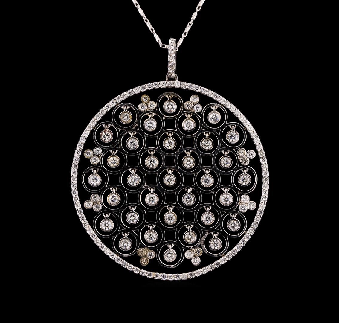One electronically tested 14KT white gold ladies combination cast & assembled diamond pendant & chain 18.0" long, fancy link with a lobster claw clasp with a bright polish finish. Identified with markings of "K14". Condition is new. Containing: One Hundred Three prong set round brilliant cut diamonds, measuring 1.80 - 1.30 x 0.93mm (depth est.) approximate total weight of 103 Stones = 1.40 ct. Clarity: SI-1 to SI-2. Color: I - J, Cut is Good. All diamonds are graded in the mounting, unless otherwise stated. Total Weight of Diamonds 1.40 ct. Total Weight of Pendant & Chain 15.90 grams. GGL Appraised.