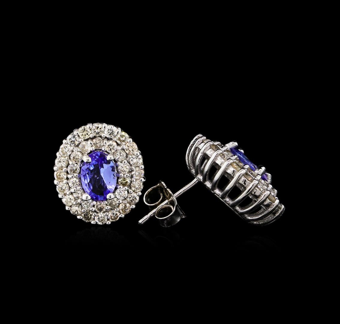 One pair electronically tested 14KT white gold Ladies combination cast & assembled stud earrings with friction posts with a bright polish finish. Condition is new. Identified with markings of "14K". Containing: Two prong set oval modified brilliant cut natural tanzanites, measuring 6.70 x 4.90 x 2.80mm, approximate. Total Weight of 1.40ct., clarity is eye clean, medium light, very slightly grayish, violet color, (GIA V 4/3), cut is good. Colored gemstones are presumed to have been subjected to commonly used color/clarity enhancement processes. Seventy-Two prong set round brilliant cut diamonds, measuring 1.50 - 1.50 x 0.90mm (depth est.) approximate. Total Weight of 72 Stones = 1.41ct. Clarity: I-1 to I-2. Color: K - L, Cut is Good. Total Weight of Colored Stones 1.40ct. Total Weight of Diamonds 1.41ct. Total Weight of Earrings 4.80 grams. GGL Appraised at $5,545.00.