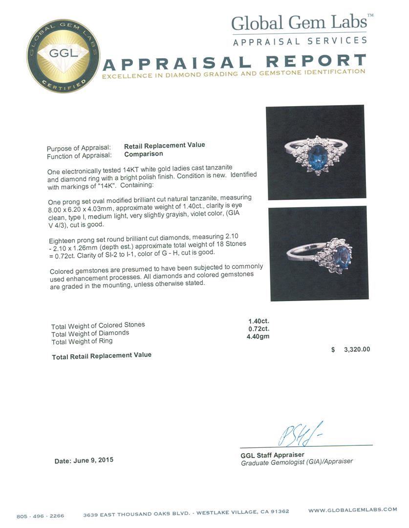 One electronically tested 14KT white gold ladies cast tanzanite and diamond ring with a bright polish finish. Identified with markings of "14K". Condition is new. Containing: One prong set oval modified brilliant cut natural tanzanite, measuring 8.00 x 6.20 x 4.03mm, approximate weight of 1.40ct., clarity is eye clean, type I, medium light, very slightly grayish, violet color, (GIA V 4/3), cut is good. Eighteen prong set round brilliant cut diamonds, measuring 2.10 - 2.10 x 1.26mm (depth est.) approximate total weight of 18 Stones = 0.72ct. Clarity: SI-2 to I-1. Color: G - H, Cut is Good. Colored gemstones are presumed to have been subjected to commonly used enhancement processes. All diamonds and colored gemstones are graded in the mounting, unless otherwise stated. Total Weight of Colored Stones 1.40ct. Total Weight of Diamonds 0.72ct. Total Weight of Ring 4.40 grams. GGL Appraised at $3,320.00.