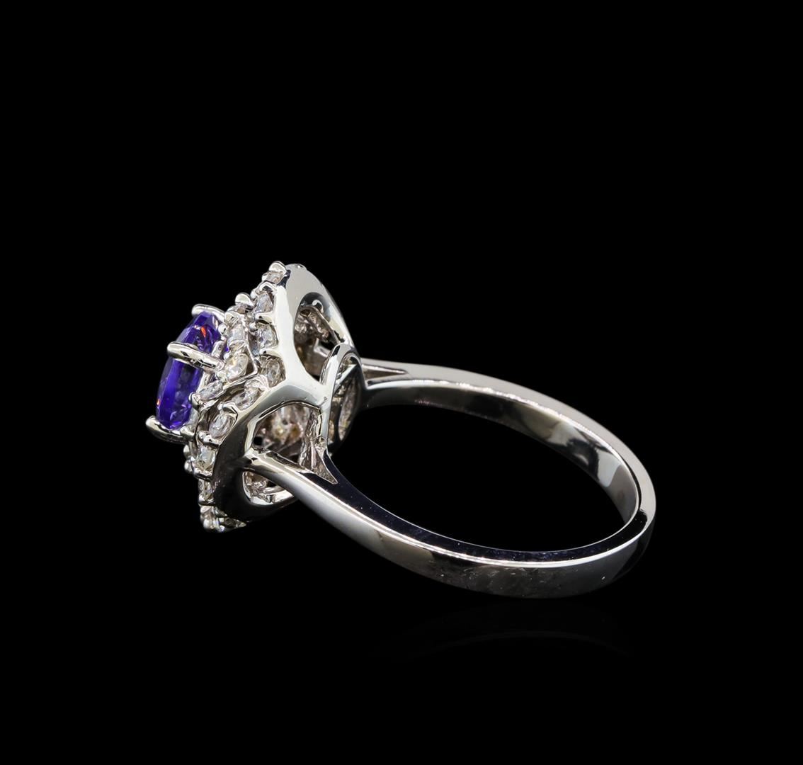 One electronically tested 14KT white gold ladies cast tanzanite and diamond ring with a bright polish finish. Identified with markings of "14K". Condition is new. Containing: One prong set round modified brilliant cut natural tanzanite, measuring 6.80 - 6.80 x 4.42 mm, approximate weight of 1.40 ct., clarity is eye clean, type I, medium light, very slightly grayish, violet color, (GIA V 4/3), cut is good. Forty prong set round brilliant cut diamonds, measuring 1.60 - 1.60 x 0.96mm (depth est.) approximate total weight of 40 Stones = 0.82ct. Clarity: SI-1 to SI-2. Color: H - I, Cut is Good. Colored gemstones are presumed to have been subjected to commonly used enhancement processes. All diamonds and colored gemstones are graded in the mounting, unless otherwise stated. Total Weight of Colored Stones 1.40 ct. Total Weight of Diamonds 0.82ct. Total Weight of Ring 5.40 grams. GGL Appraised.