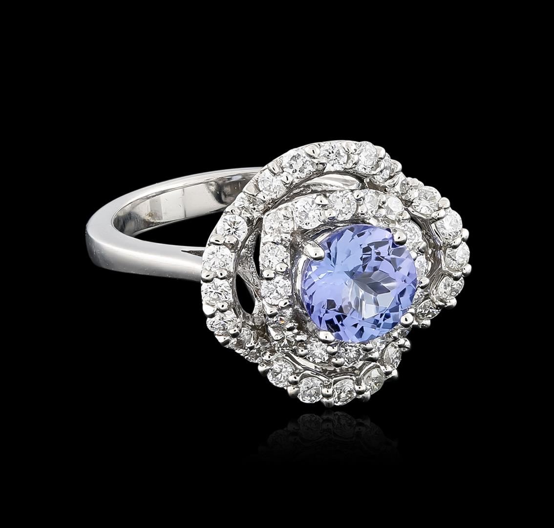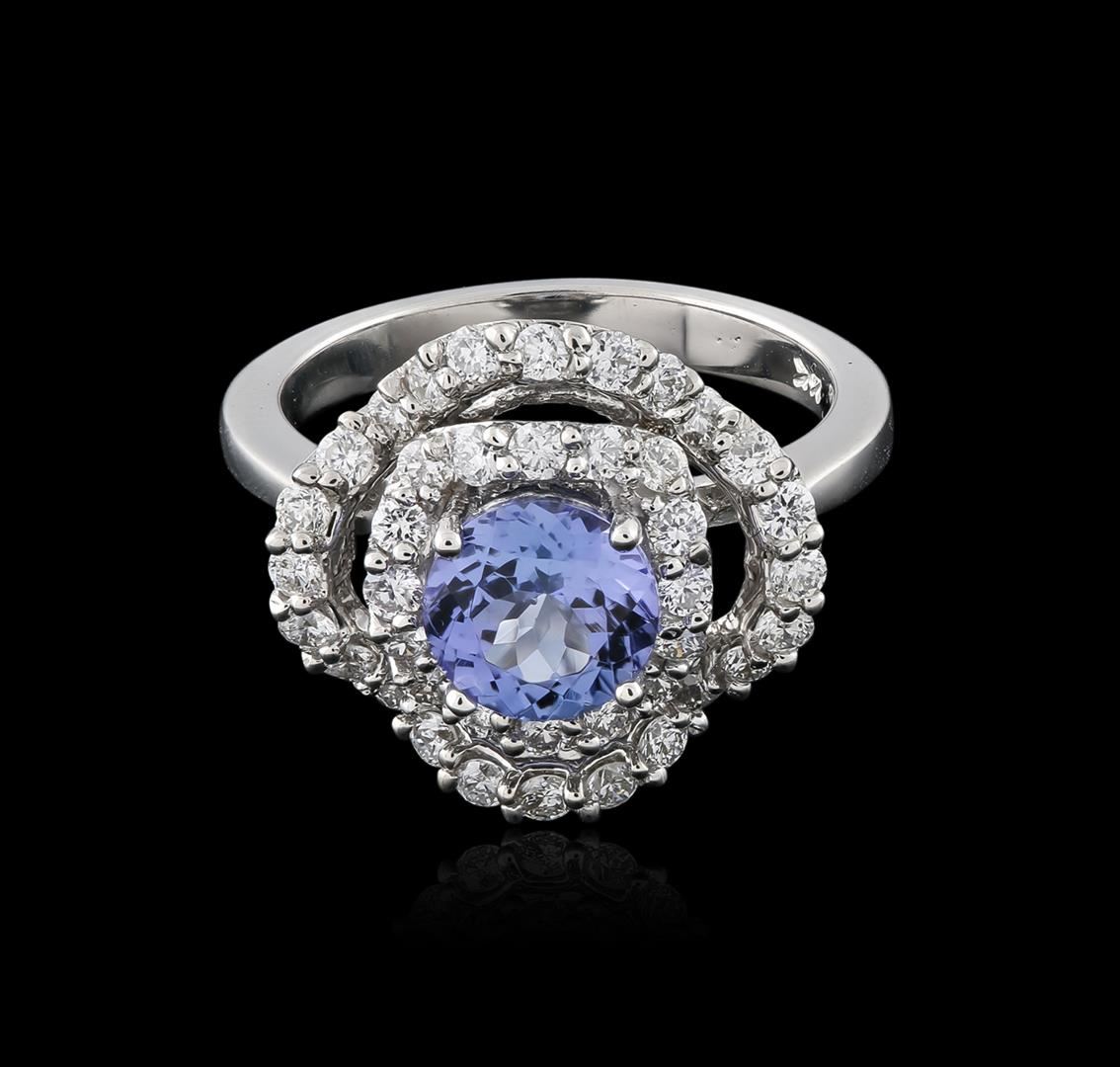 One electronically tested 14KT white gold ladies cast tanzanite and diamond ring with a bright polish finish. Identified with markings of "14K". Condition is new. Containing: One prong set round modified brilliant cut natural tanzanite, measuring 6.80 - 6.80 x 4.42 mm, approximate weight of 1.40ct., clarity is eye clean, type I, medium light, very slightly grayish, violet color, (GIA V 4/3), cut is good. Forty prong set round brilliant cut diamonds, measuring 1.60 - 1.60 x 0.96mm (depth est.) approximate total weight of 40 Stones = 0.82ct. Clarity: SI-1 to SI-2. Color: H - I, Cut is Good. Colored gemstones are presumed to have been subjected to commonly used enhancement processes. All diamonds and colored gemstones are graded in the mounting, unless otherwise stated. Total Weight of Colored Stones 1.40ct. Total Weight of Diamonds 0.82ct. Total Weight of Ring 5.40 grams. GGL Appraised at $2,975.00.