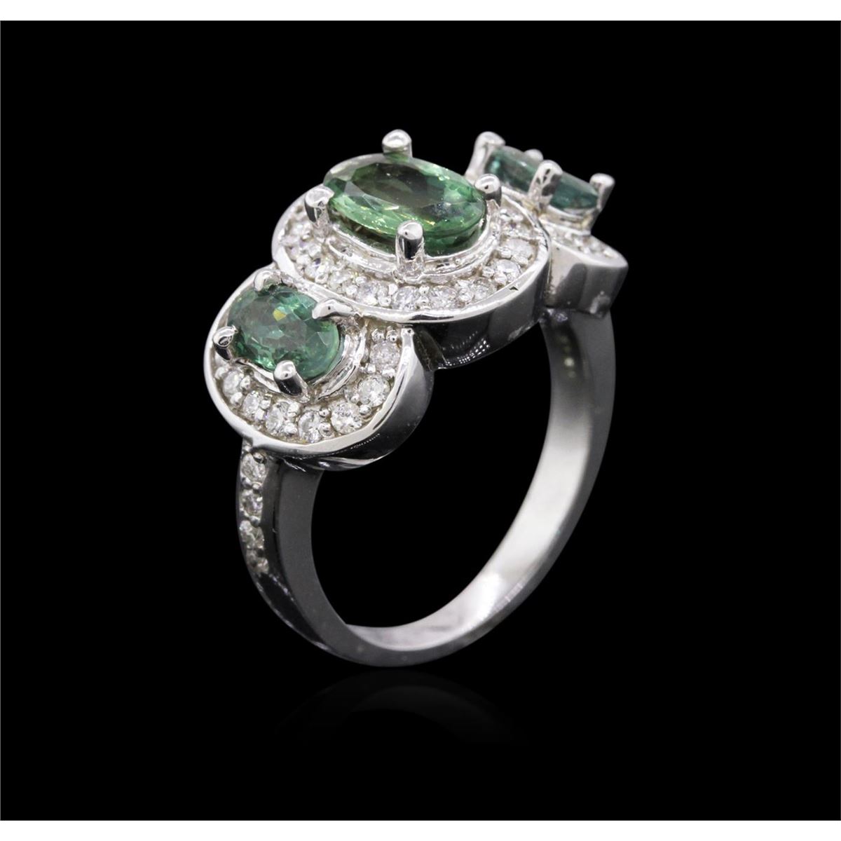 One electronically tested 14KT white gold ladies combination cast & assembled alexandrite and diamond ring with a flat shank with a bright polish finish. Identified with markings of "14K". Condition is new. Containing: One prong set oval modified brilliant cut natural alexandrite, measuring 8.17 x 4.89 x 2.06mm, approximate weight of 0.64ct., clarity is slightly included, type II, light, slightly grayish, bluish green color, (GIA bG 3/2), cut is good. Two prong set oval modified brilliant cut natural alexandrites, measuring 5.92 x 3.78 x 2.19mm, approximate total weight of 0.76ct., clarity is slightly included, type II, light, slightly grayish, bluish green color, (GIA bG 3/2), cut is good. Forty-Six prong set round brilliant cut diamonds, measuring 1.30 - 1.30 x 0.78mm (depth est.) approximate total weight of 46 Stones = 0.37ct. Clarity: I-1 to I-2. Color: I - J, Cut is Good. All diamonds and colored gemstones are graded in the mounting, unless otherwise stated. Colored gemstones are presumed to have been subjected to commonly used enhancement processes. Total Weight of Colored Stones 1.40ct. Total Weight of Diamonds 0.37ct. Total Weight of Ring 6.50 grams. GGL Appraised at $6,025.00.