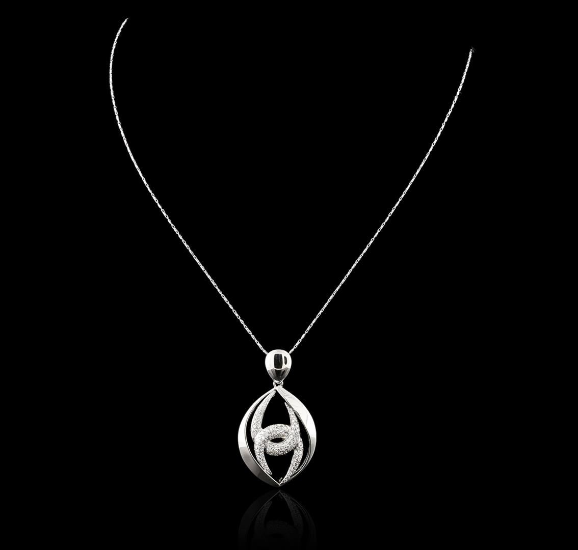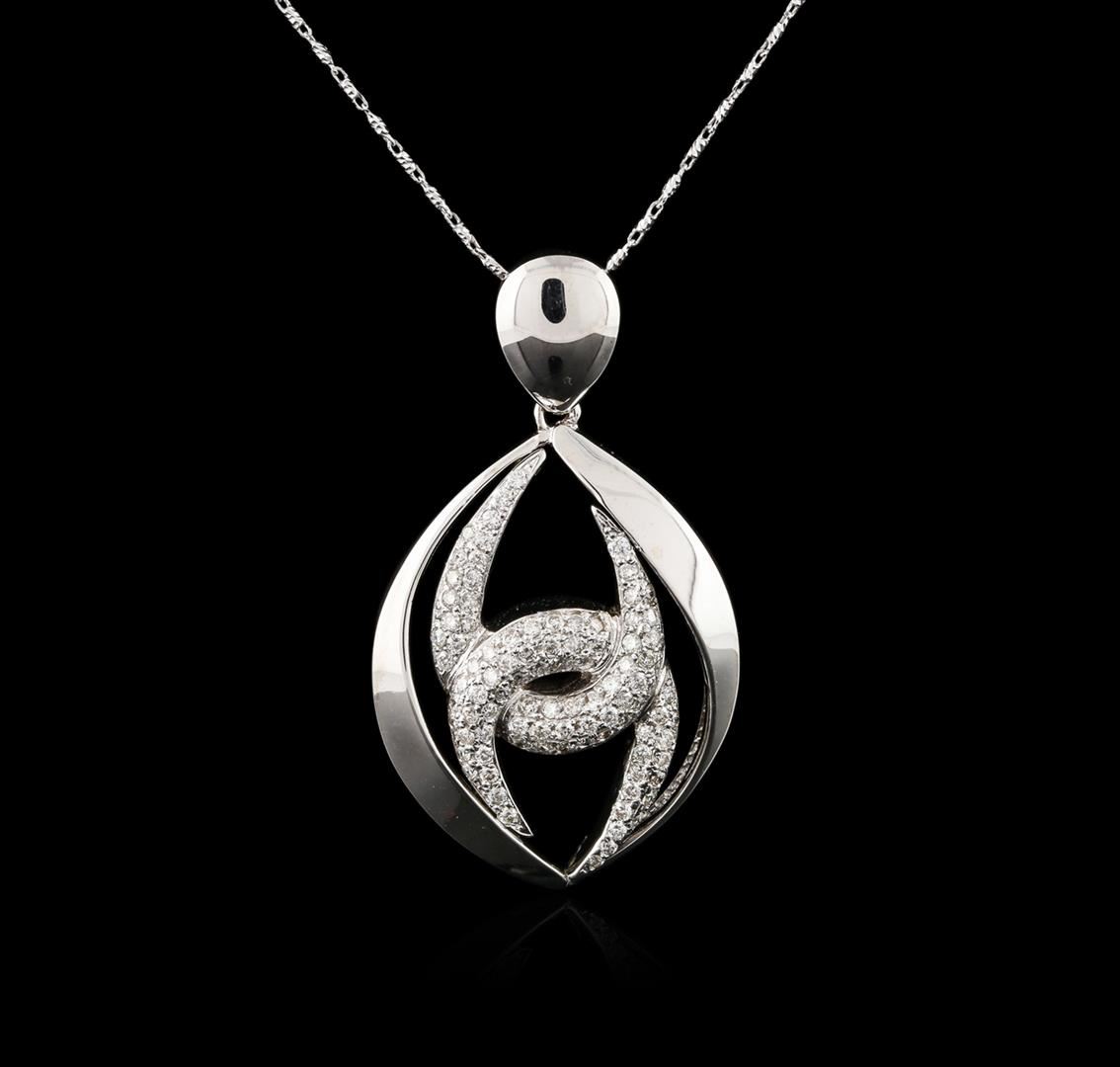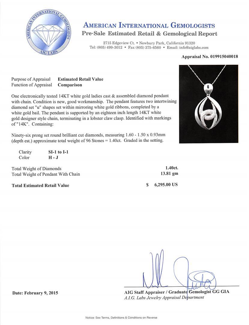 One electronically tested 14KT white gold ladies cast & assembled diamond pendant with chain. The pendant features two intertwining diamond set "u" shapes set within mirroring white gold ribbons, completed by a white gold bail. The pendant is supported by an eighteen inch length 14KT white gold designer style chain, terminating in a lobster claw clasp. Identified with markings of "14K". Condition is new, good workmanship. Containing: Ninety-Six prong set round brilliant cut diamonds, measuring 1.60 - 1.50 x 0.93mm (depth est.) approximate total weight of 96 Stones = 1.40ct. Graded in the setting. Clarity: SI-1 to I-1. Color: H - J. Total Weight of Diamonds 1.40ct. Total Weight of Pendant With Chain 13.81 grams. AIG Appraised at $6,295.00.