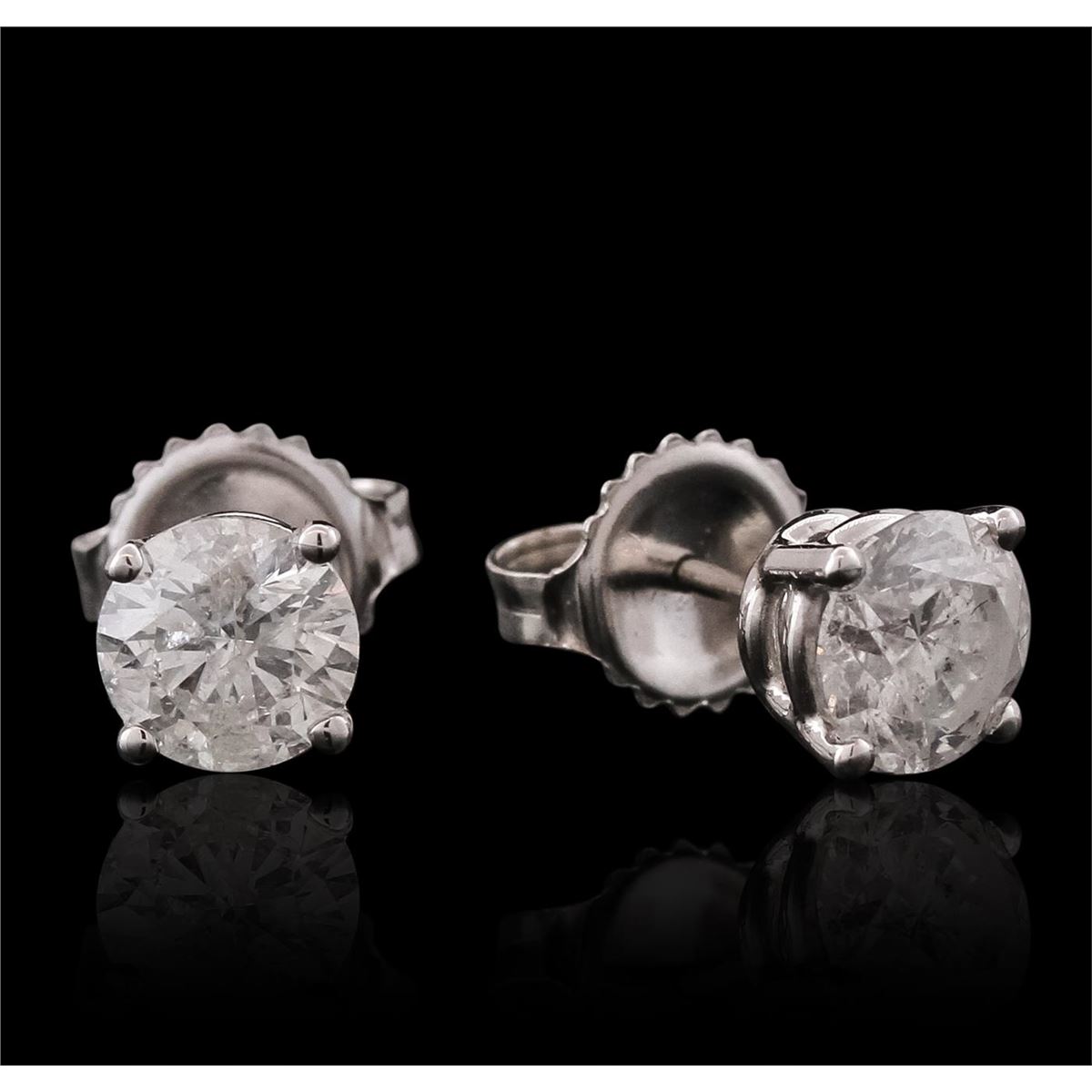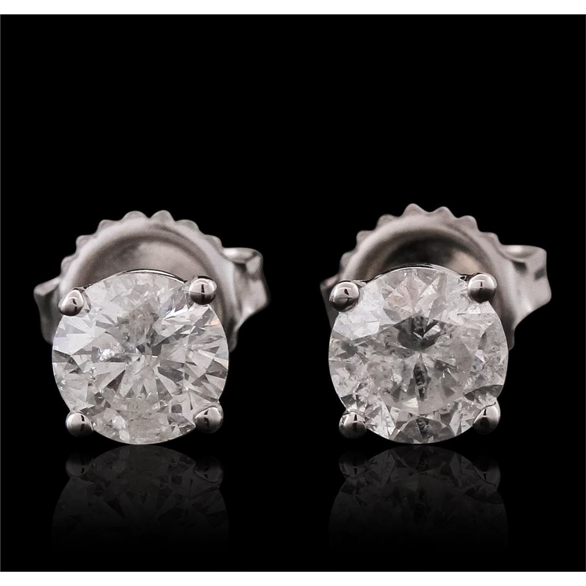 One pair electronically tested 14KT white gold ladies cast stud earrings with friction posts with a bright polish finish. Identified with markings of "14K". Condition is new. Containing: One prong set round brilliant cut diamond, measuring 5.72 - 5.71 x 3.42mm (depth est.) approximate weight of 0.68ct. Clarity: I-3. Color: I, Cut is Good. One prong set round brilliant cut diamond, measuring 5.81 - 5.80 x 3.51mm (depth est.) approximate weight of 0.72ct. Clarity: I-3. Color: I, Cut is Good. All diamonds are graded in the mounting, unless otherwise stated total weight of Diamonds 1.40ct. Total Weight of Earrings 1.60 grams. GGL Appraised at $4,475.00.