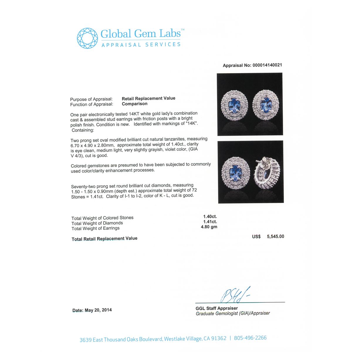One pair electronically tested 14KT white gold Ladies combination cast & assembled stud earrings with friction posts with a bright polish finish. Condition is new. Identified with markings of "14K". Containing: Two prong set oval modified brilliant cut natural tanzanites, measuring 6.70 x 4.90 x 2.80mm, approximate. Total Weight of 1.40ct., clarity is eye clean, medium light, very slightly grayish, violet color, (GIA V 4/3), cut is good. Colored gemstones are presumed to have been subjected to commonly used color/clarity enhancement processes. Seventy-Two prong set round brilliant cut diamonds, measuring 1.50 - 1.50 x 0.90mm (depth est.) approximate. Total Weight of 72 Stones = 1.41ct. Clarity: I-1 to I-2. Color: K - L, Cut is Good. Total Weight of Colored Stones 1.40ct. Total Weight of Diamonds 1.41ct. Total Weight of Earrings 4.80 grams. GGL Appraised at $5,545.00.