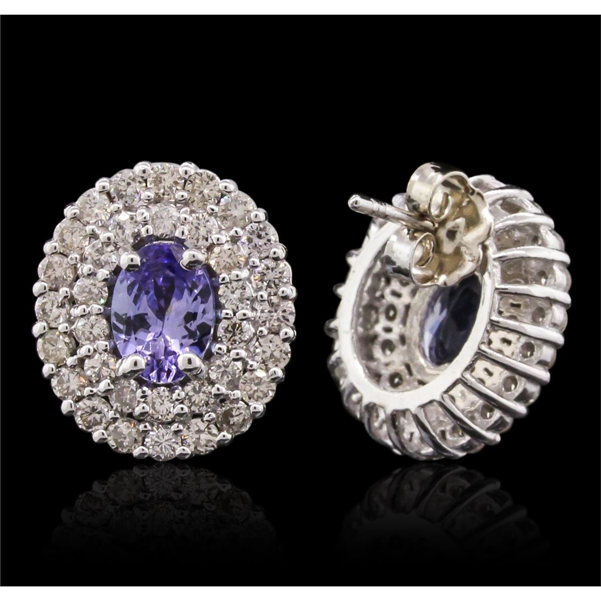 One pair electronically tested 14KT white gold Ladies combination cast & assembled stud earrings with friction posts with a bright polish finish. Condition is new. Identified with markings of "14K". Containing: Two prong set oval modified brilliant cut natural tanzanites, measuring 6.70 x 4.90 x 2.80mm, approximate. Total Weight of 1.40ct., clarity is eye clean, medium light, very slightly grayish, violet color, (GIA V 4/3), cut is good. Colored gemstones are presumed to have been subjected to commonly used color/clarity enhancement processes. Seventy-Two prong set round brilliant cut diamonds, measuring 1.50 - 1.50 x 0.90mm (depth est.) approximate. Total Weight of 72 Stones = 1.41ct. Clarity: I-1 to I-2. Color: K - L, Cut is Good. Total Weight of Colored Stones 1.40ct. Total Weight of Diamonds 1.41ct. Total Weight of Earrings 4.80 grams. GGL Appraised at $5,545.00.