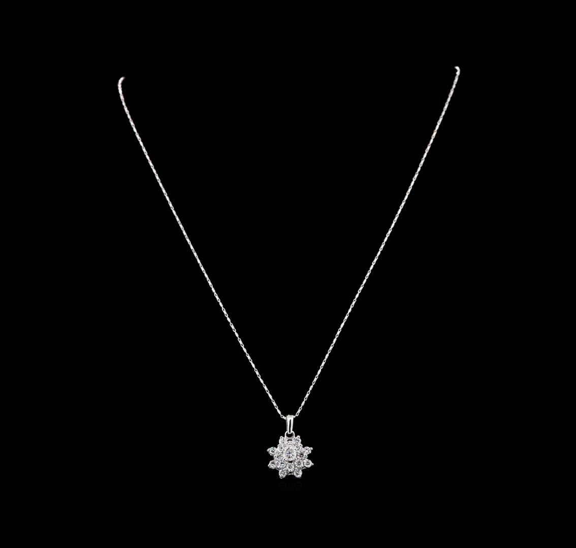One electronically tested 14KT white gold ladies cast diamond pendant & chain 18.0" long, with a spring ring clasp with a bright polish finish. Condition is new. Containing: One prong set round brilliant cut diamond, measuring 4.50 - 4.50 x 2.70mm (depth est.) approximate total weight of 0.39ct. Clarity: SI-2. Color: I, Cut is Good. Sixteen prong set round brilliant cut diamonds, measuring 2.50 - 2.50 x 1.50mm (depth est.) approximate total weight of 16 Stones = 1.02ct. Clarity: SI-1 to SI-2. Color: I - J, Cut is Good. All diamonds are graded in the mounting, unless otherwise stated. Total Weight of Diamonds 1.41ct. Total Weight of Pendant & Chain 5.86 grams. GGL Appraised at $4,955.00.