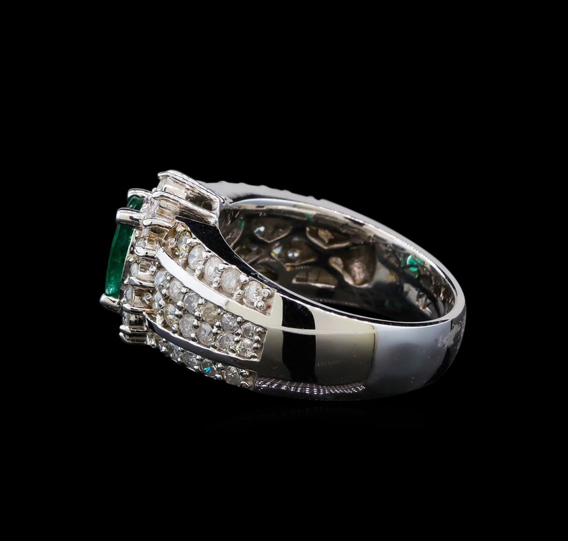 One electronically tested 14KT white gold ladies cast emerald and diamond ring with a bright polish finish. Identified with markings of "14K". Condition is very good. Containing: One prong set oval modified brilliant cut natural emerald, measuring 8.20 x 6.80 x 4.42mm, approximate total weight of 1.41ct., clarity is heavily included, type III, medium, moderately strong, green color, (GIA G 5/4)Sixty prong set round brilliant cut diamonds, measuring 1.90 - 1.30 x 0.96mm (depth est.) approximate total weight of 60 Stones = 0.89ct. Clarity: I-1 to I-2. Color: I - J. Colored gemstones are presumed to have been subjected to commonly used enhancement processes. All diamonds and colored gemstones are graded in the mounting, unless otherwise stated. Total Weight of Colored Stones 1.41ct. Total Weight of Diamonds 0.89ct. Total Weight of Ring 9.20 grams. GGL Appraised.