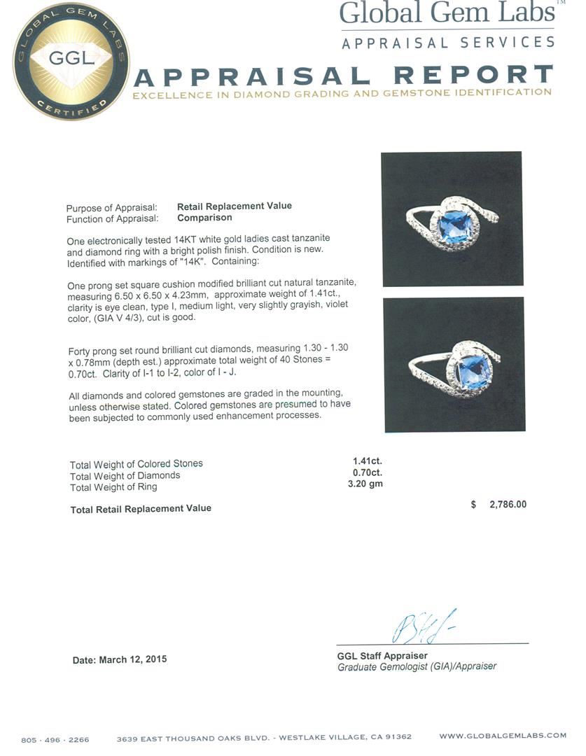 One electronically tested 14KT white gold ladies cast tanzanite and diamond ring with a bright polish finish. Identified with markings of "14K". Condition is new. Containing: One prong set square cushion modified brilliant cut natural tanzanite, measuring 6.50 x 6.50 x 4.23mm, approximate weight of 1.41ct., clarity is eye clean, type I, medium light, very slightly grayish, violet color, (GIA V 4/3), cut is good. Forty prong set round brilliant cut diamonds, measuring 1.30 - 1.30 x 0.78mm (depth est.) approximate total weight of 40 Stones = 0.70ct. Clarity: I-1 to I-2. Color: I - J. All diamonds and colored gemstones are graded in the mounting, unless otherwise stated. Colored gemstones are presumed to have been subjected to commonly used enhancement processes. Total Weight of Colored Stones 1.41ct. Total Weight of Diamonds 0.70ct. Total Weight of Ring 3.20 grams. GGL Appraised at $2,786.00.