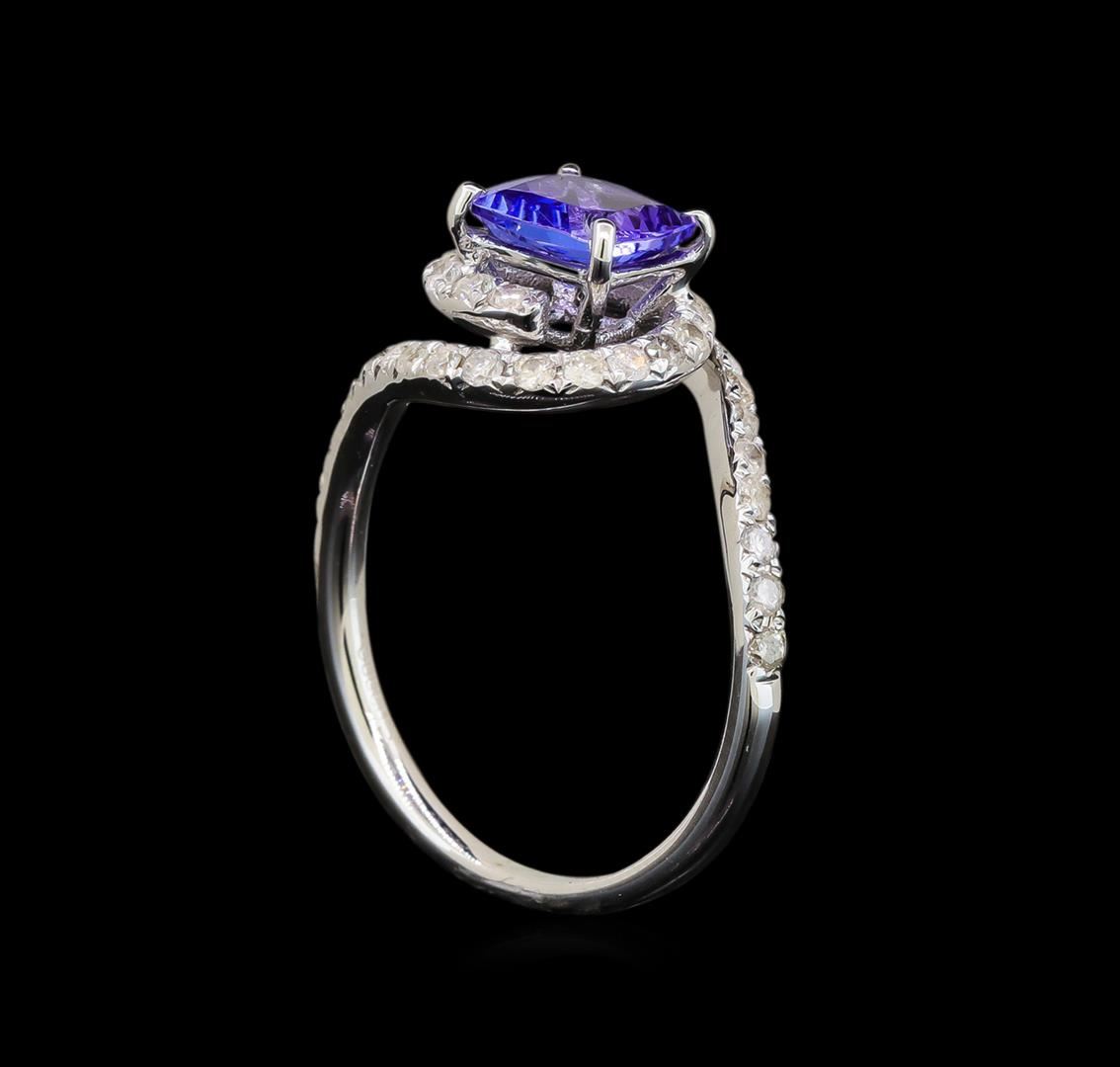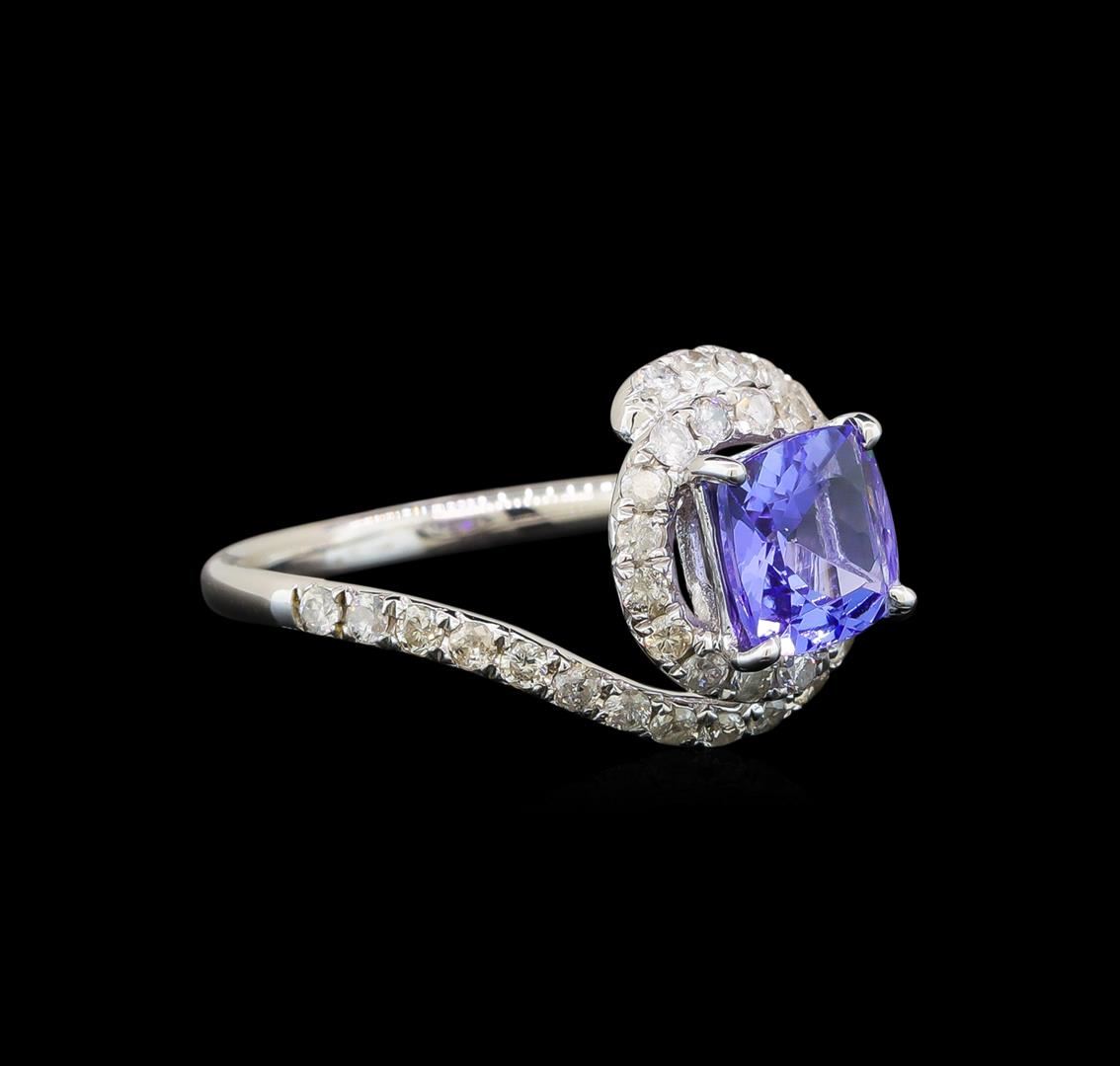 One electronically tested 14KT white gold ladies cast tanzanite and diamond ring with a bright polish finish. Identified with markings of "14K". Condition is new. Containing: One prong set square cushion modified brilliant cut natural tanzanite, measuring 6.50 x 6.50 x 4.23mm, approximate weight of 1.41ct., clarity is eye clean, type I, medium light, very slightly grayish, violet color, (GIA V 4/3), cut is good. Forty prong set round brilliant cut diamonds, measuring 1.30 - 1.30 x 0.78mm (depth est.) approximate total weight of 40 Stones = 0.70ct. Clarity: I-1 to I-2. Color: I - J. All diamonds and colored gemstones are graded in the mounting, unless otherwise stated. Colored gemstones are presumed to have been subjected to commonly used enhancement processes. Total Weight of Colored Stones 1.41ct. Total Weight of Diamonds 0.70ct. Total Weight of Ring 3.20 grams. GGL Appraised at $2,786.00.