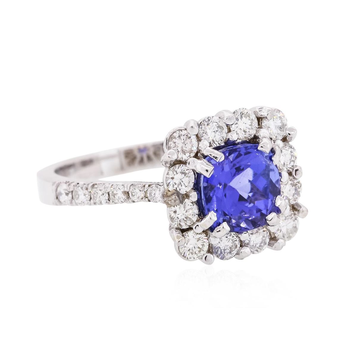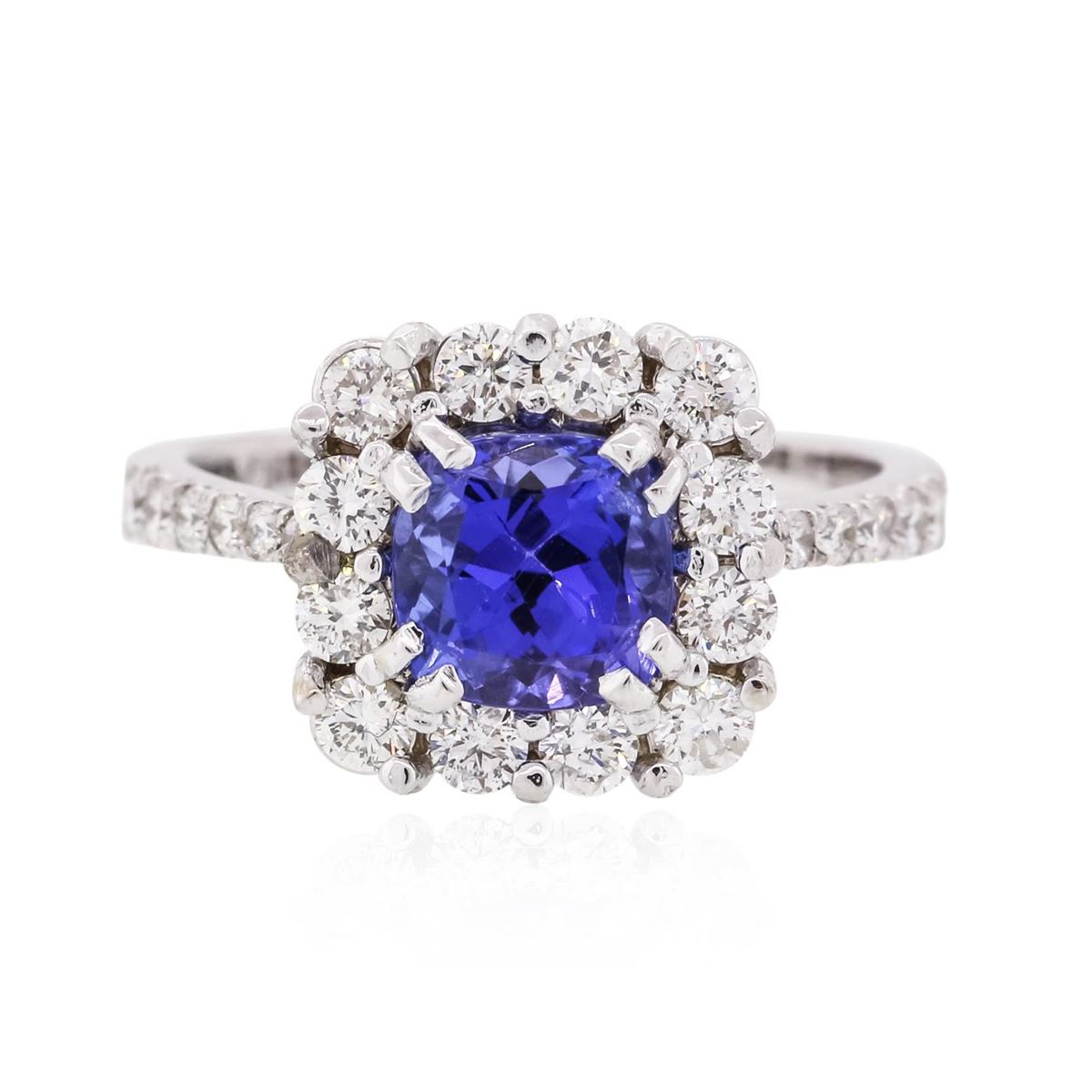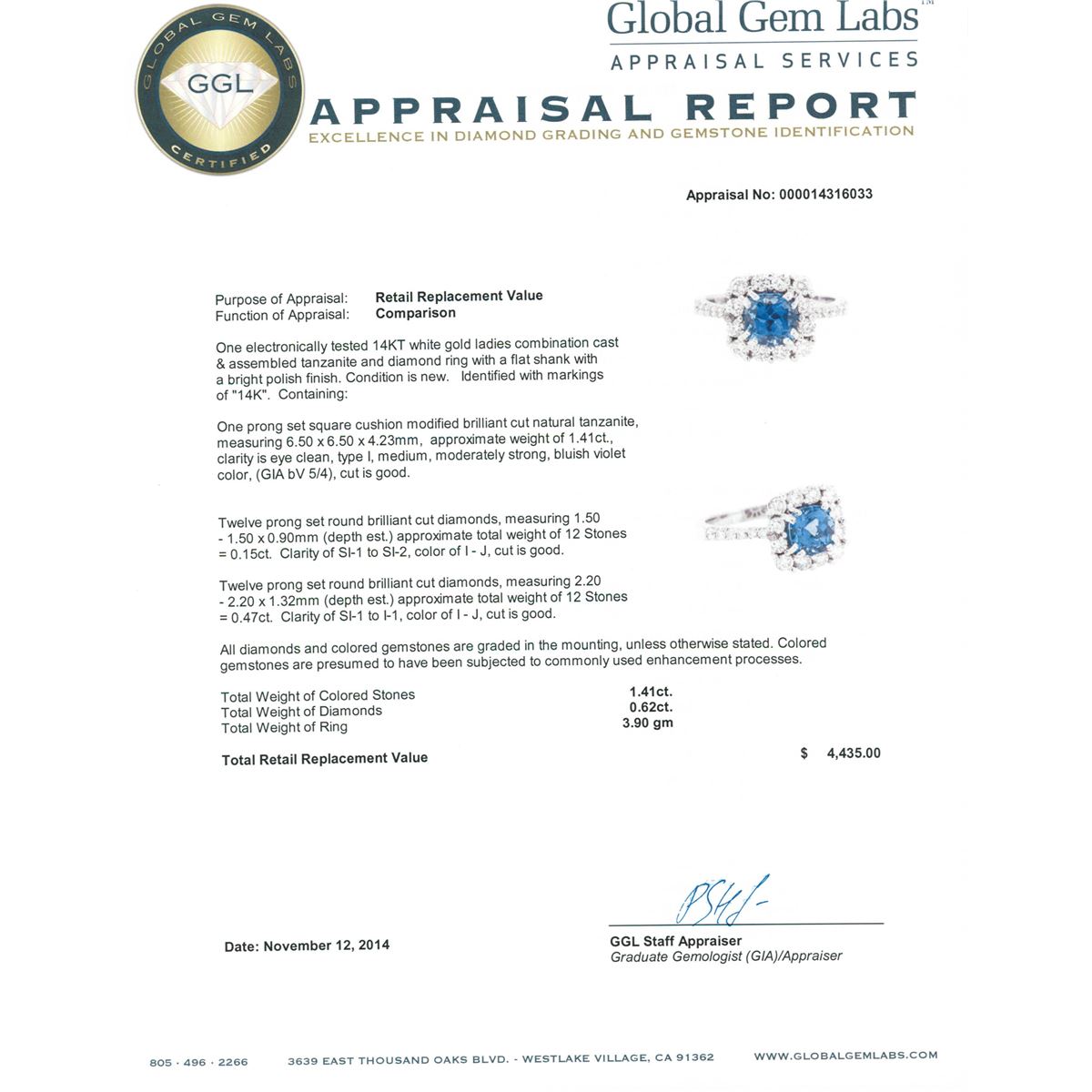 One electronically tested 14KT white gold ladies combination cast & assembled tanzanite and diamond ring with a flat shank with a bright polish finish. Identified with markings of "14K". Condition is new. Containing: One prong set square cushion modified brilliant cut natural tanzanite, measuring 6.50 x 6.50 x 4.23mm, approximate weight of 1.41ct., clarity is eye clean, type I, medium, moderately strong, bluish violet color, (GIA bV 5/4), cut is good. Twelve prong set round brilliant cut diamonds, measuring 1.50 - 1.50 x 0.90mm (depth est.) approximate total weight of 12 Stones = 0.15ct. Clarity: SI-1 to SI-2. Color: I - J, Cut is Good. Twelve prong set round brilliant cut diamonds, measuring 2.20 - 2.20 x 1.32mm (depth est.) approximate total weight of 12 Stones = 0.47ct. Clarity: SI-1 to I-1. Color: I - J, Cut is Good. All diamonds and colored gemstones are graded in the mounting, unless otherwise stated. Colored gemstones are presumed to have been subjected to commonly used enhancement processes. Total Weight of Colored Stones 1.41ct. Total Weight of Diamonds 0.62ct. Total Weight of Ring 3.90 grams. GGL Appraised at $4,435.00.