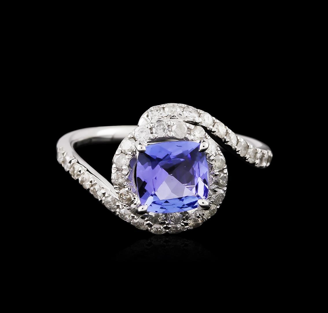 One electronically tested 14KT white gold ladies cast tanzanite and diamond ring with a bright polish finish. Identified with markings of "14K". Condition is new. Containing: One prong set square cushion modified brilliant cut natural tanzanite, measuring 6.50 x 6.50 x 4.23mm, approximate weight of 1.41ct., clarity is eye clean, type I, medium light, very slightly grayish, violet color, (GIA V 4/3), cut is good. Forty prong set round brilliant cut diamonds, measuring 1.30 - 1.30 x 0.78mm (depth est.) approximate total weight of 40 Stones = 0.70ct. Clarity: I-1 to I-2. Color: I - J. All diamonds and colored gemstones are graded in the mounting, unless otherwise stated. Colored gemstones are presumed to have been subjected to commonly used enhancement processes. Total Weight of Colored Stones 1.41ct. Total Weight of Diamonds 0.70ct. Total Weight of Ring 3.20 grams. GGL Appraised at $2,786.00.