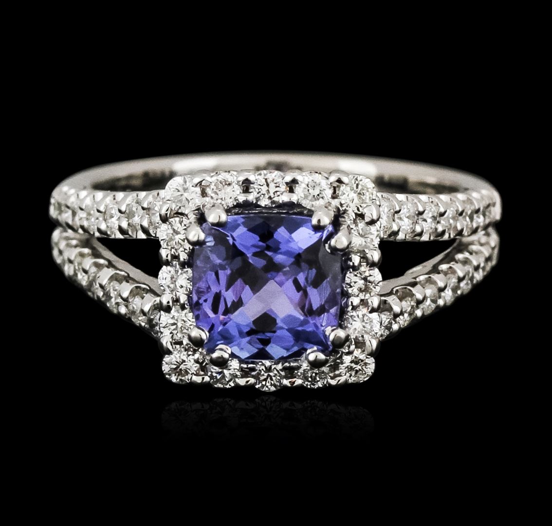 One electronically tested 14KT white gold ladies combination cast & assembled tanzanite and diamond ring with a bright polish finish. Identified with markings of "14K". Condition is new. Containing: One prong set square cushion modified brilliant cut natural tanzanite, measuring 6.50 x 6.50 x 4.23mm, approximate weight of 1.41ct., clarity is eye clean, type I, medium light, very slightly grayish, violet color, (GIA V 4/3), cut is good. Forty-Four prong set round brilliant cut diamonds, measuring 1.50 - 1.50 x 0.90mm (depth est.) approximate total weight of 44 Stones = 0.54ct. Clarity: SI-2 to I-1. Color: I - J, Cut is Good. Colored gemstones are presumed to have been subjected to commonly used enhancement processes. All diamonds and colored gemstones are graded in the mounting, unless otherwise stated. Total Weight of Colored Stones 1.41ct. Total Weight of Diamonds 0.54ct. Total Weight of Ring 5.50 grams. GGL Appraised at $4,080.00.