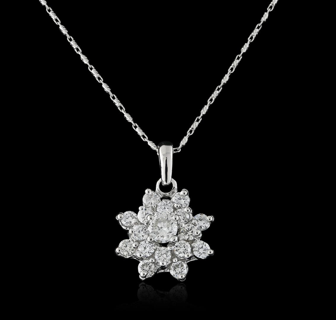 One electronically tested 14KT white gold ladies cast diamond pendant & chain 18.0" long, with a spring ring clasp with a bright polish finish. Condition is new. Containing: One prong set round brilliant cut diamond, measuring 4.50 - 4.50 x 2.70mm (depth est.) approximate total weight of 0.39ct. Clarity: SI-2. Color: I, Cut is Good. Sixteen prong set round brilliant cut diamonds, measuring 2.50 - 2.50 x 1.50mm (depth est.) approximate total weight of 16 Stones = 1.02ct. Clarity: SI-1 to SI-2. Color: I - J, Cut is Good. All diamonds are graded in the mounting, unless otherwise stated. Total Weight of Diamonds 1.41ct. Total Weight of Pendant & Chain 5.86 grams. GGL Appraised at $4,955.00.