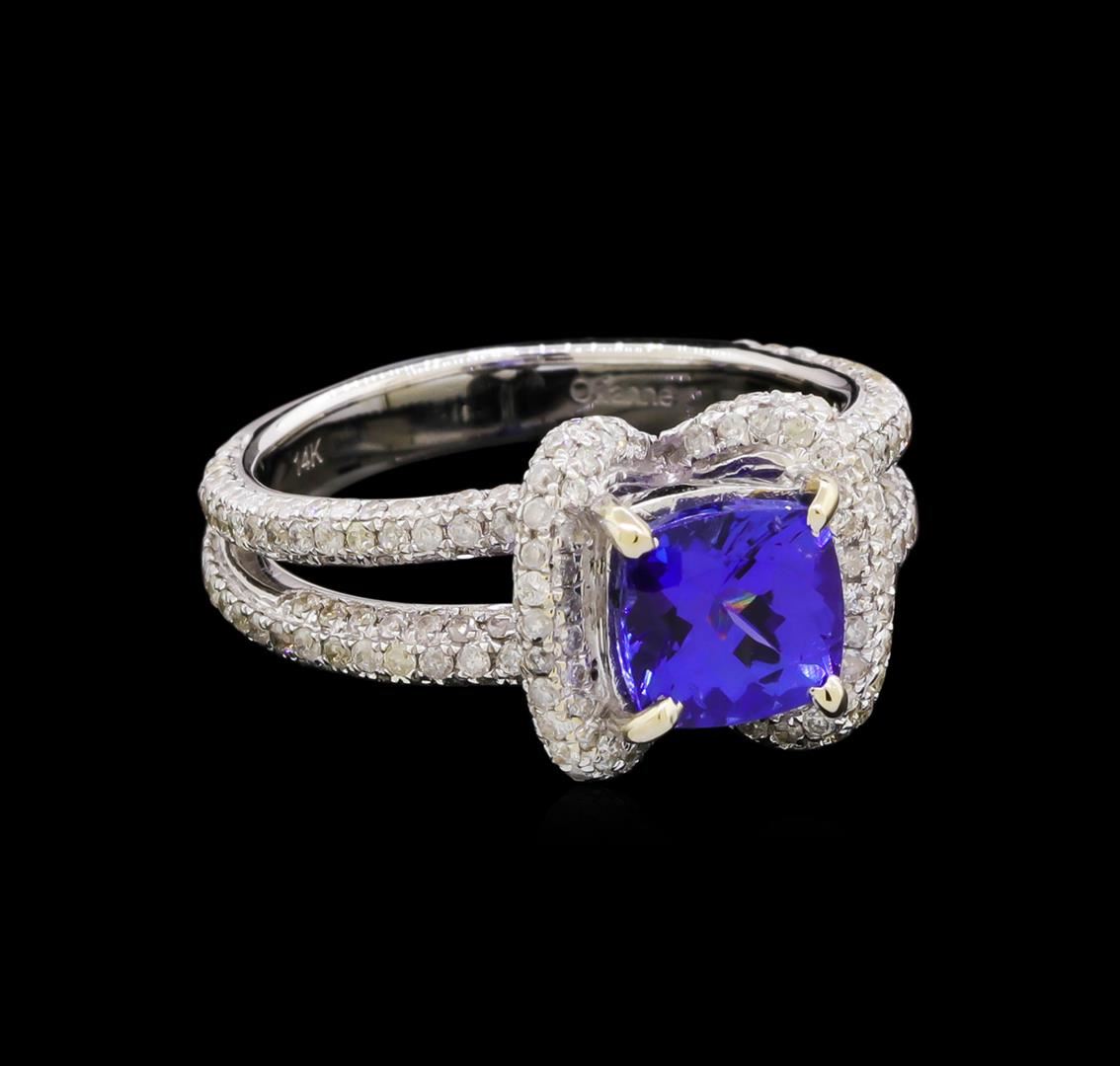 One electronically tested 14KT white gold ladies combination cast & assembled tanzanite and diamond ring with a split shank with a bright polish finish. Identified with markings of "14K". Condition is new. Containing: One prong set square cushion modified brilliant cut natural tanzanite, measuring 6.53 x 6.51 x 4.24mm, approximate weight of 1.42ct., clarity is eye clean, type I, medium, moderately strong, bluish violet color, (GIA bV 5/4), cut is good. Three Hundred Two prong set round brilliant cut diamonds, measuring 1.10 - 1.10 x 0.66mm (depth est.) approximate total weight of 302 Stones = 1.45ct. Clarity: I-1 to I-2. Color: I - J, Cut is Good. Colored gemstones are presumed to have been subjected to commonly used enhancement processes. All diamonds and colored gemstones are graded in the mounting, unless otherwise stated. Total Weight of Colored Stones 1.42ct. Total Weight of Diamonds 1.45ct. Total Weight of Ring 5.80 grams. GGL Appraised at $6,190.00.