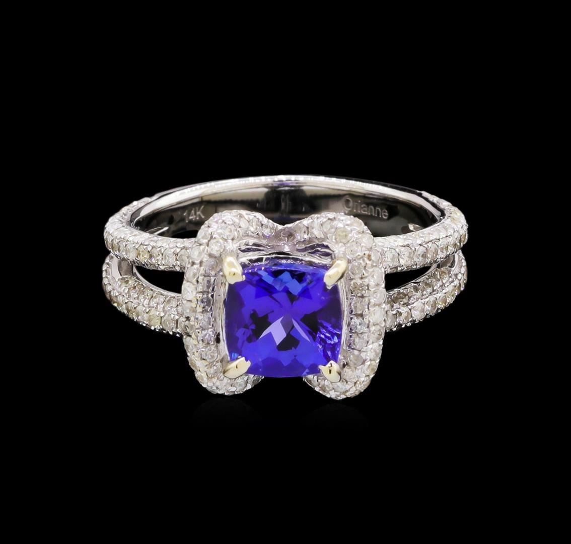 One electronically tested 14KT white gold ladies combination cast & assembled tanzanite and diamond ring with a split shank with a bright polish finish. Identified with markings of "14K". Condition is new. Containing: One prong set square cushion modified brilliant cut natural tanzanite, measuring 6.53 x 6.51 x 4.24mm, approximate weight of 1.42ct., clarity is eye clean, type I, medium, moderately strong, bluish violet color, (GIA bV 5/4), cut is good. Three Hundred Two prong set round brilliant cut diamonds, measuring 1.10 - 1.10 x 0.66mm (depth est.) approximate total weight of 302 Stones = 1.45ct. Clarity: I-1 to I-2. Color: I - J, Cut is Good. Colored gemstones are presumed to have been subjected to commonly used enhancement processes. All diamonds and colored gemstones are graded in the mounting, unless otherwise stated. Total Weight of Colored Stones 1.42ct. Total Weight of Diamonds 1.45ct. Total Weight of Ring 5.80 grams. GGL Appraised at $6,190.00.