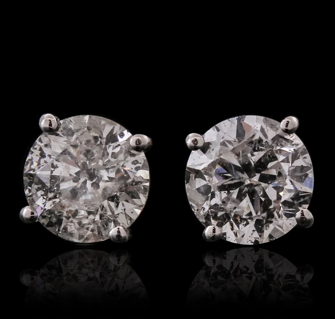 One pair electronically tested 14KT white gold cast & assembled diamond solitaire earrings with screw backs. Condition is new, good workmanship. Containing: One prong set round brilliant cut diamond, measuring 5.65 - 5.62 x 3.50mm (depth est.), 7.00% GTCF approximate weight of 0.72ct with a medium blue fluorescence. Graded in the setting. Clarity: I-2. Color: 62.1%. Table 58.5%. One prong set round brilliant cut diamond, measuring 5.60 - 5.50 x 3.60mm (depth est.), 3.00% GTCF approximate weight of 0.70ct with a faint blue fluorescence. Graded in the setting. Clarity: I-2. Color: I. Depth 64.9%. Table 54.1%. Total Weight of Diamonds 1.42ct. Total Weight of Earrings 0.84 grams. AIG Appraised at $5,600.00.