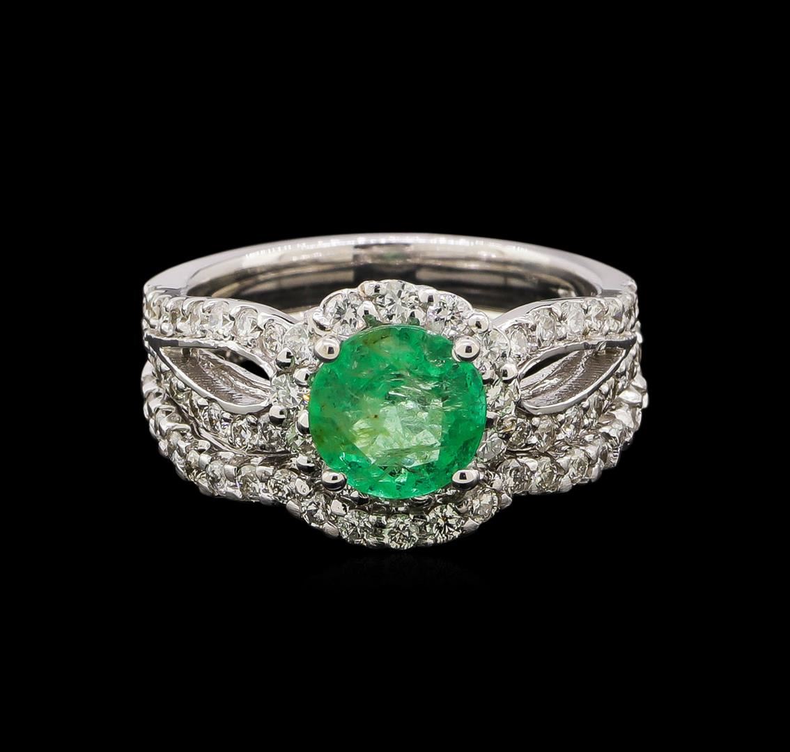 One electronically tested 14KT white gold ladies cast emerald and diamond engagement ring & wedding band with a bright polish finish. Identified with markings of "K14". Condition is new. Containing: One prong set round modified brilliant cut natural emerald, measuring 7.40 - 7.40 x 4.81 mm, approximate weight of 1.43ct., clarity is heavily included, type III, medium light, very slightly grayish, very slightly bluish green color, (GIA vslbG 4/3), cut is good. Sixty-Five prong set round brilliant cut diamonds, measuring 1.60 - 1.60 x 0.96mm (depth est.) approximate total weight of 65 Stones = 0.97ct. Clarity: I-1 to I-2. Color: G - H, Cut is Good. Colored gemstones are presumed to have been subjected to commonly used enhancement processes. All diamonds and colored gemstones are graded in the mounting, unless otherwise stated. Total Weight of Colored Stones 1.43ct. Total Weight of Diamonds 0.97ct. Total Weight of Engagement Ring & Wedding Band 7.30 grams. GGL Appraised at $4,815.00.