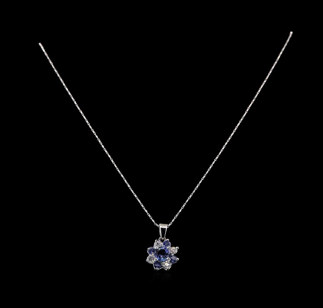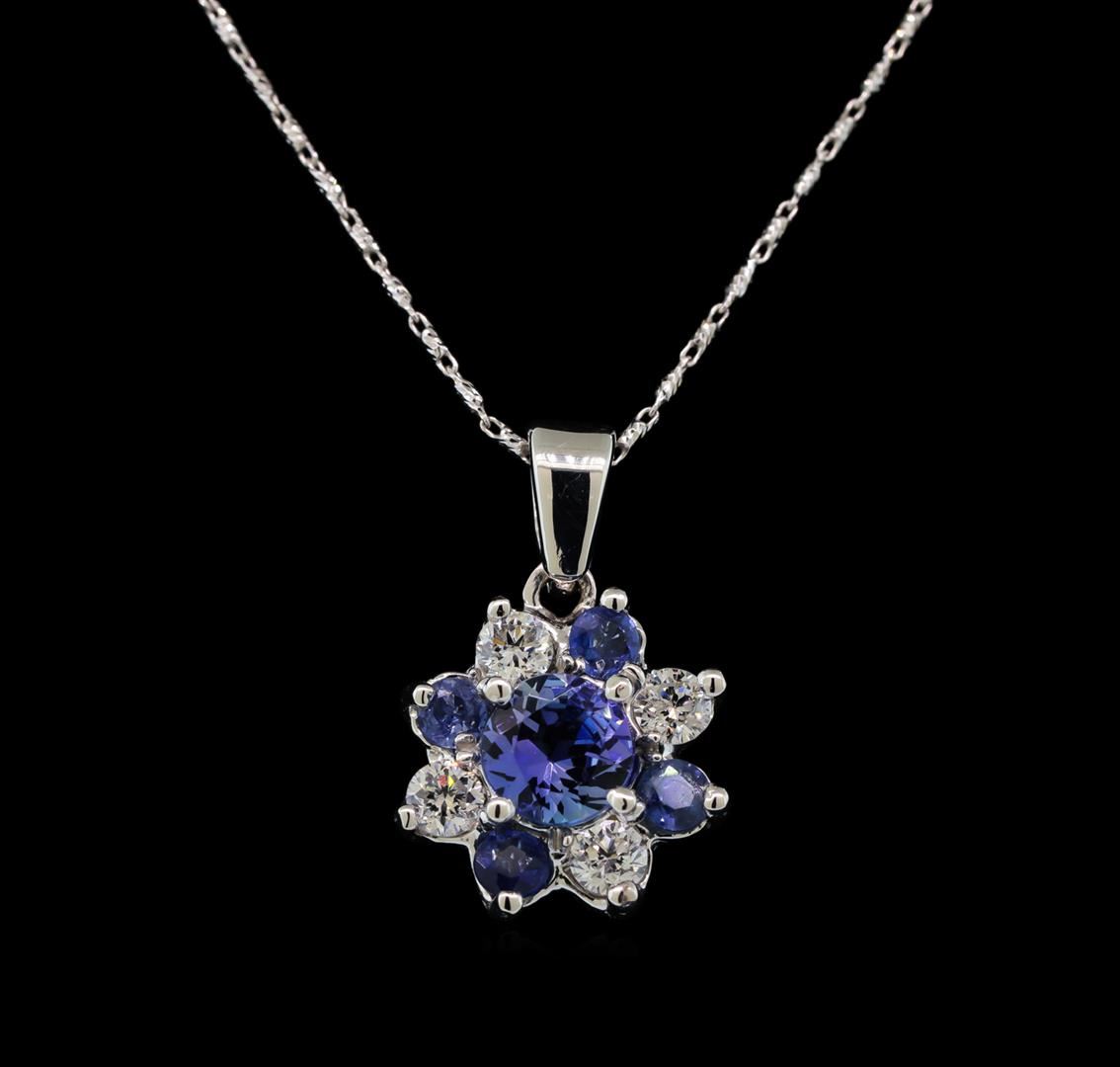 One electronically tested 14KT white gold ladies combination cast & assembled tanzanite, sapphire and diamond pendant & chain 18.0" long, with a lobster claw clasp with a bright polish finish. Identified with markings of "14K". Condition is new. Containing: One prong set round modified brilliant cut natural tanzanite, measuring 6.90 - 6.90 x 4.49 mm, approximate weight of 1.43ct., clarity is eye clean, type I, medium light, moderately strong, violet color, (GIA V 4/4), cut is good. Four prong set round modified brilliant cut natural blue sapphires, measuring 4.00 - 4.00 x 2.60 mm, approximate total weight of 1.32ct., clarity is heavily included, type II, medium light, very slightly grayish, violetish blue color, (GIA vB 4/3). Four prong set round brilliant cut diamonds, measuring 3.50 - 3.50 x 2.10mm (depth est.) approximate total weight of 4 Stones = 0.63ct. Clarity of SI-1 to SI-2, Color of I - J, Cut is Good. All diamonds and colored gemstones are graded in the mounting, unless otherwise stated. Colored gemstones are presumed to have been subjected to commonly used enhancement processes. Total Weight of Colored Stones 2.75ct. Total Weight of Diamonds 0.63ct. Total Weight of Pendant & Chain 6.20 grams. GGL Appraised at $4,270.00.