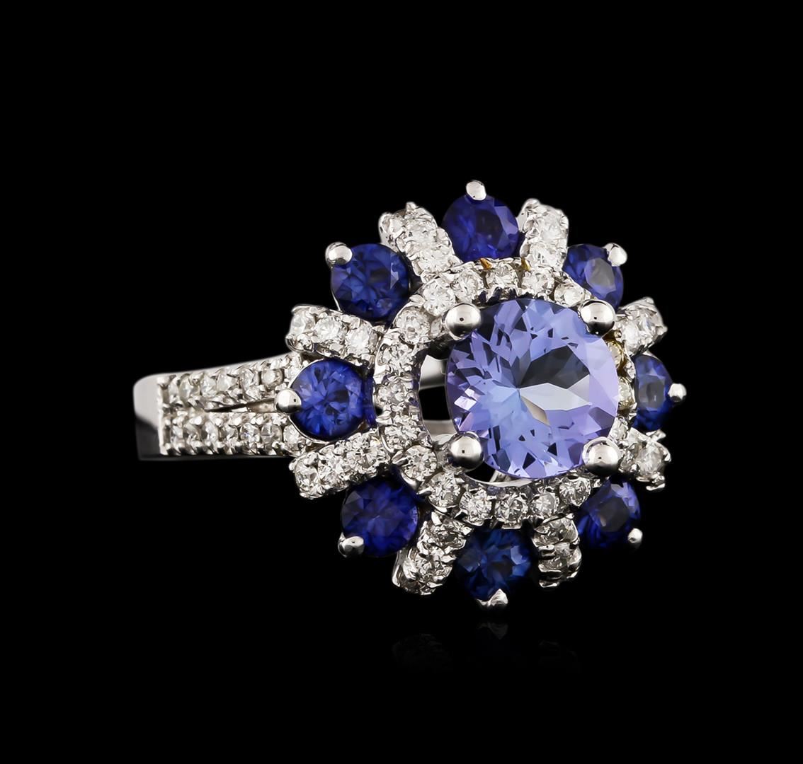 One electronically tested 14KT white gold ladies cast tanzanite, sapphire and diamond ring with a bright polish finish. Identified with markings of "14K". Condition is new. Containing: One prong set round modified brilliant cut natural tanzanite, measuring 6.90 - 6.90 x 4.49 mm, approximate weight of 1.43ct., clarity is eye clean, type I, medium light, very slightly grayish, violet color, (GIA V 4/3), cut is good. Eight prong set round modified brilliant cut natural blue sapphires, measuring 3.00 - 3.00 x 1.95 mm, approximate total weight of 1.12ct., clarity is slightly included, type II, medium, moderately strong, blue color, (GIA B 5/4), cut is good. Seventy-Two prong set round brilliant cut diamonds, measuring 1.30 - 1.30 x 0.78mm (depth est.) approximate total weight of 72 Stones = 0.58ct. Clarity of SI-2 to I-2, Color of I - J, Cut is Good. Colored gemstones are presumed to have been subjected to commonly used enhancement processes. All diamonds and colored gemstones are graded in the mounting, unless otherwise stated. Total Weight of Colored Stones 2.55ct. Total Weight of Diamonds 0.58ct. Total Weight of Ring 6.50 grams. GGL Appraised at $4,425.00.