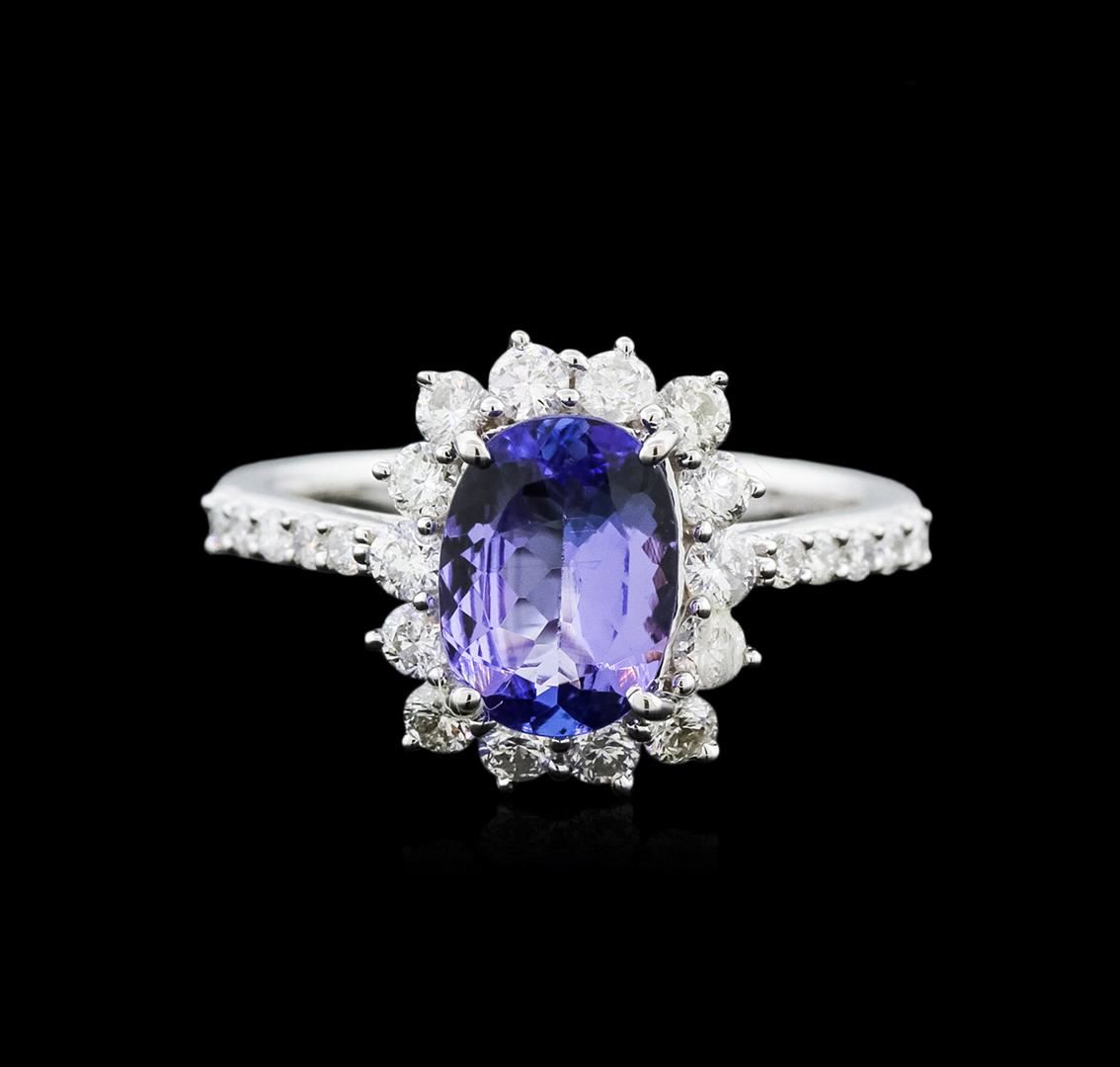 One electronically tested 14KT white gold ladies cast tanzanite and diamond ring with a flat shank with a bright polish finish. Trademark is Orianne. Identified with markings of "14K". Condition is new. Containing: One prong set oval modified brilliant cut natural tanzanite, measuring 9.11 x 6.78 x 3.30mm, approximate weight of 1.43ct., clarity is eye clean, type I, medium light, very slightly grayish, violet color, (GIA V 4/3), cut is good. Fourteen prong set round brilliant cut diamonds, measuring 2.00 - 2.00 x 1.20mm (depth est.) approximate total weight of 14 Stones = 0.41ct. Clarity: SI-1 to SI-2. Color: I - J. Fifteen prong set round brilliant cut diamonds, measuring 1.50 - 1.50 x 0.90mm (depth est.) approximate total weight of 15 Stones = 0.19ct. Clarity: SI-2 to I-1. Color: I - J. All diamonds and colored gemstones are graded in the mounting, unless otherwise stated. Colored gemstones are presumed to have been subjected to commonly used enhancement processes. Total Weight of Colored Stones 1.43ct. Total Weight of Diamonds 0.59ct. Total Weight of Ring 3.20 grams. GGL Appraised at $3,125.00.