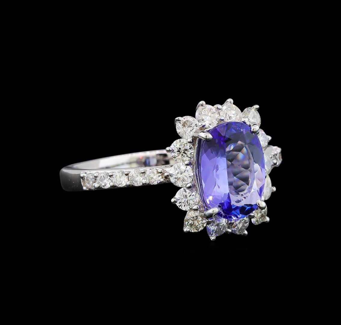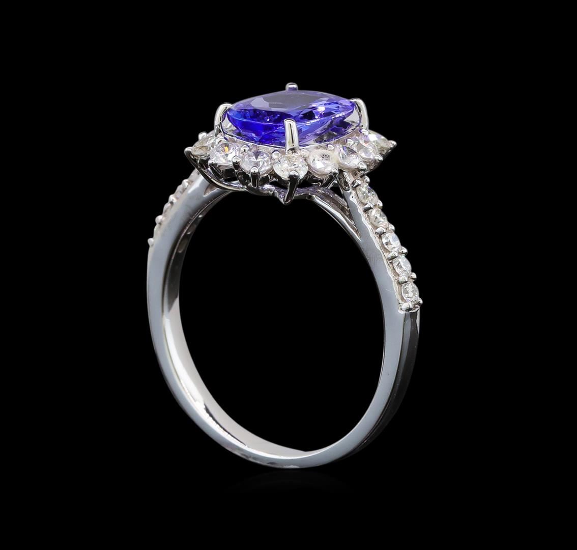 One electronically tested 14KT white gold ladies cast tanzanite and diamond ring with a flat shank with a bright polish finish. Trademark is Orianne. Identified with markings of "14K". Condition is new. Containing: One prong set oval modified brilliant cut natural tanzanite, measuring 9.11 x 6.78 x 3.30mm, approximate weight of 1.43ct., clarity is eye clean, type I, medium light, very slightly grayish, violet color, (GIA V 4/3), cut is good. Fourteen prong set round brilliant cut diamonds, measuring 2.00 - 2.00 x 1.20mm (depth est.) approximate total weight of 14 Stones = 0.41ct. Clarity: SI-1 to SI-2. Color: I - J. Fifteen prong set round brilliant cut diamonds, measuring 1.50 - 1.50 x 0.90mm (depth est.) approximate total weight of 15 Stones = 0.19ct. Clarity: SI-2 to I-1. Color: I - J. All diamonds and colored gemstones are graded in the mounting, unless otherwise stated. Colored gemstones are presumed to have been subjected to commonly used enhancement processes. Total Weight of Colored Stones 1.43ct. Total Weight of Diamonds 0.59ct. Total Weight of Ring 3.20 grams. GGL Appraised at $3,125.00.